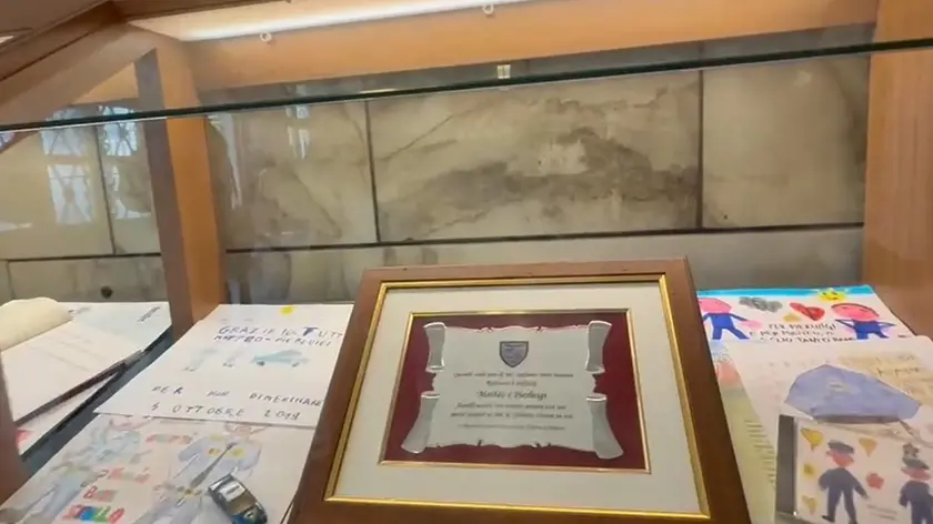 Un'automobilina della Polizia con scritte di ricordo con il pennarello nero, una t-shirt con la scritta "Figli delle stelle", e poi fotografie, lettere affettuose, un fermacarte con la scritto "vi voglio bene, per sempre".