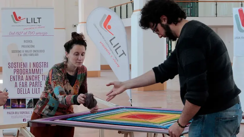 Salcioli, con l’aiuto di alcuni collaboratori, diventati più numerosi in serata, ha utilizzato i fili di lana posizionandoli con estrema attenzione, uno alla volta, creando un disegno quadrato, che via via nel corso della giornata è diventato sempre più grande, allestito nell’ampio spazio messo a disposizione gratuitamente dal Comune di Trieste. La preparazione non è stata aperta al pubblico, a causa delle norme anti Covid-19, ma molte persone hanno sbirciato l’evento in corso dalle grandi finestre dell’ex Pescheria, tanti invece hanno seguito l’evoluzione della tela colorata grazie alla diretta Facebook sulla pagina della Lilt Trieste.