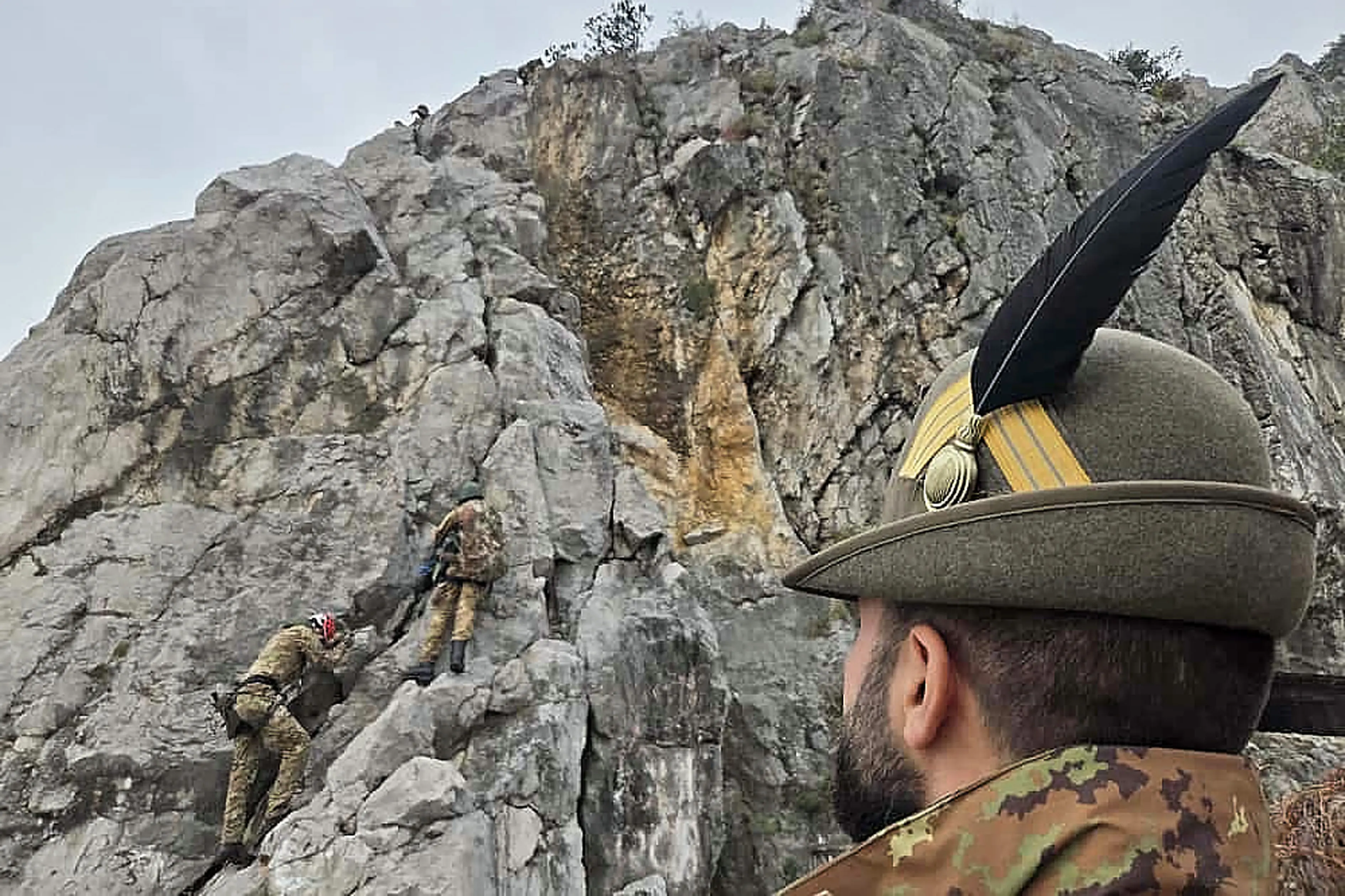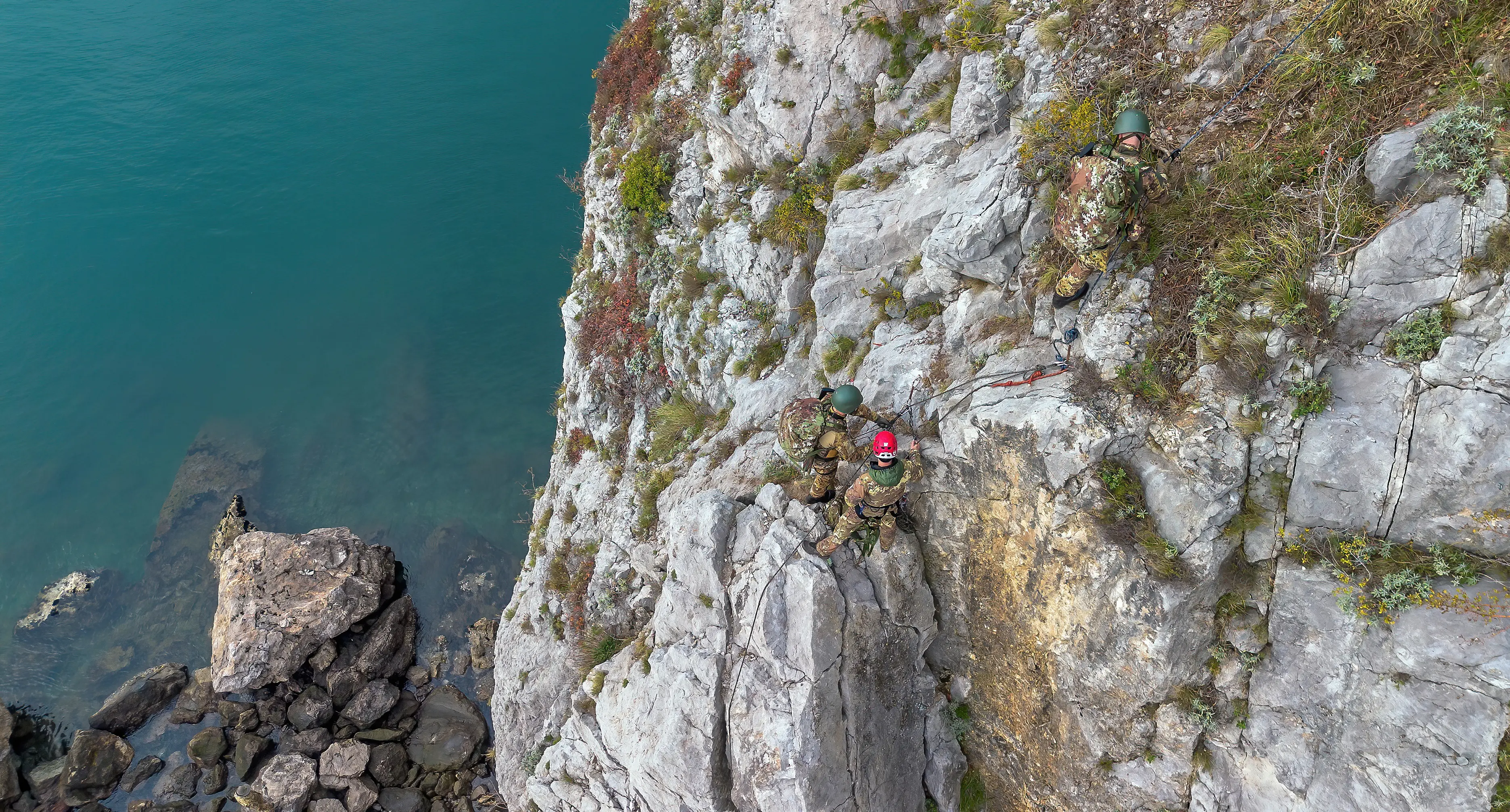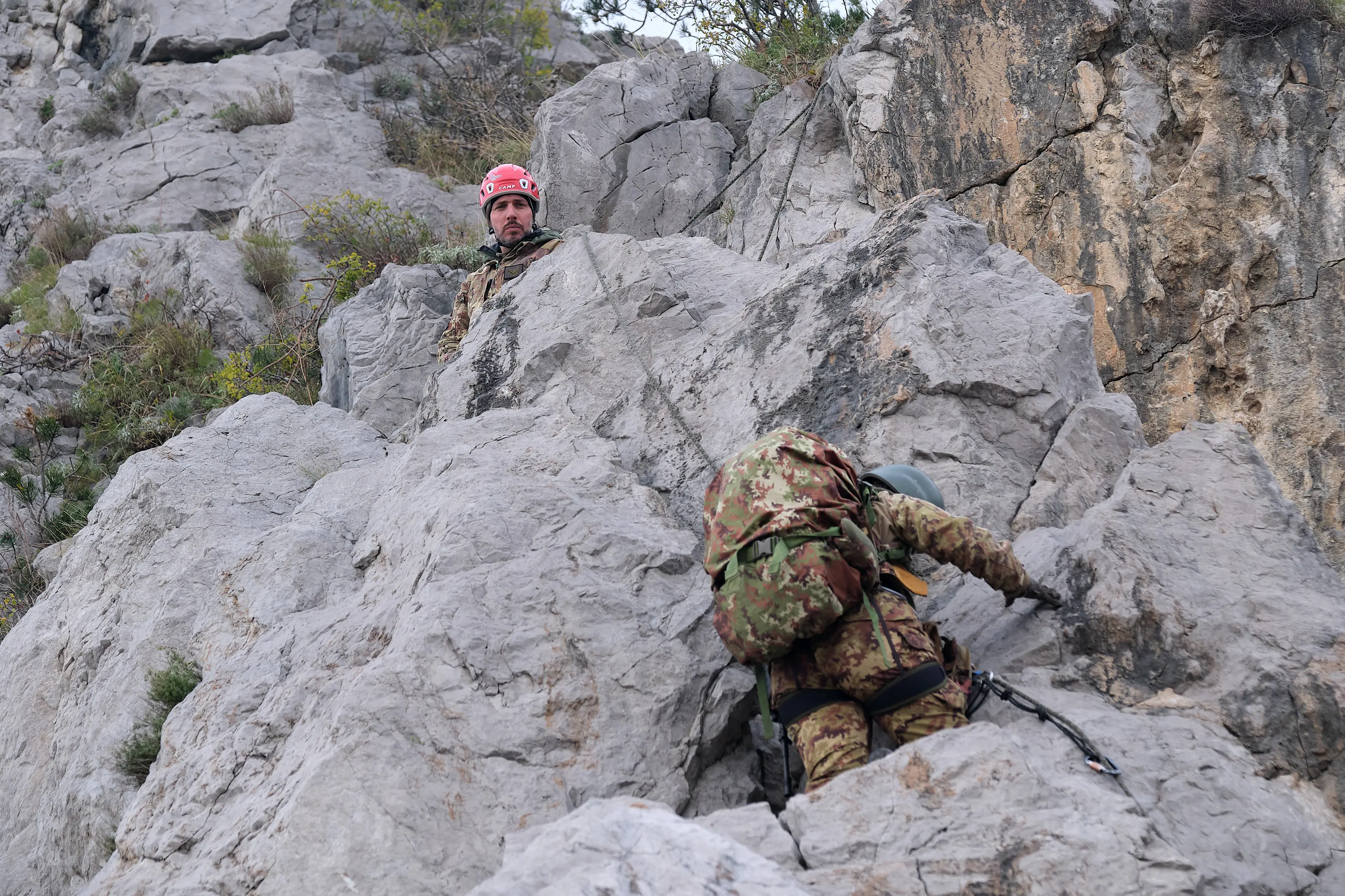 Con il peso dello zaino sulle spalle, il fucile al fianco e gli scarponi da montagna ai piedi, l’ascesa è faticosa e non semplice. Bisogna essere concentrati e vigili. Il pericolo non viene solo dal “nemico”: «Sasso», grida un allievo per avvisare che da sotto il suo piede si è staccata una pietra e che questa sta precipitando nel vuoto. Una volta in cima, gli allievi affrontano l’avversario e al termine dell’ingaggio scendono in corda doppia per poi passare alla prova successiva.