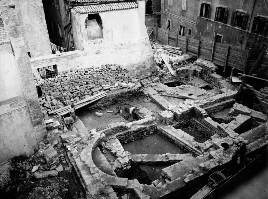 Nell’estate del 1913, infatti, demolite alcune case venne recuperato lo spazio dell’attuale piazzetta Riccardo, ma prima vennero condotti vasti scavi dinnanzi all’arco ed emerse un ampio complesso di costruzioni disposte su più livelli, in una situazione stratigrafica piuttosto articolata.