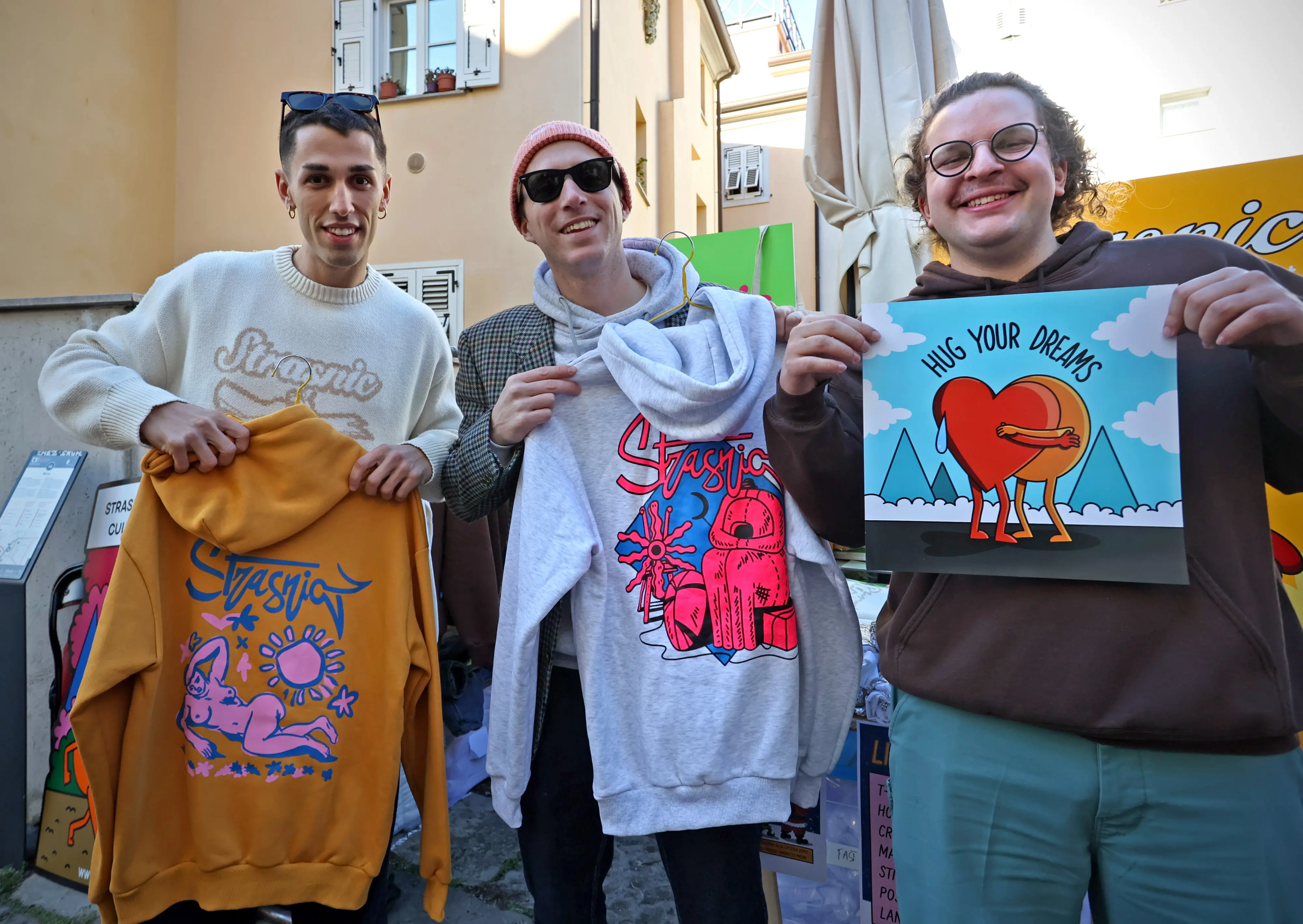 Partendo proprio dagli ex studenti del Nordio, William Marsiglia, Diego Visconti e Stefano Pitacco sono i fondatori di “Strasnic”. «Abbiamo iniziato nel 2016, in classe, a scuola, pensando di sviluppare un nostro progetto e così siamo andato avanti, con successo, con t-shirt, felpe e altri gadget. William realizza i disegni – spiega Diego – Stefano si occupa del marketing e io della produzione vera e propria, che avviene qui a Trieste, con tessuti Made in Italy e siamo molto soddisfatti». Ieri la postazione dei tre ragazzi ha attirato l’attenzione di tante persone, che hanno scelto di acquistare i capi colorati e vivaci pensati dal gruppo.
