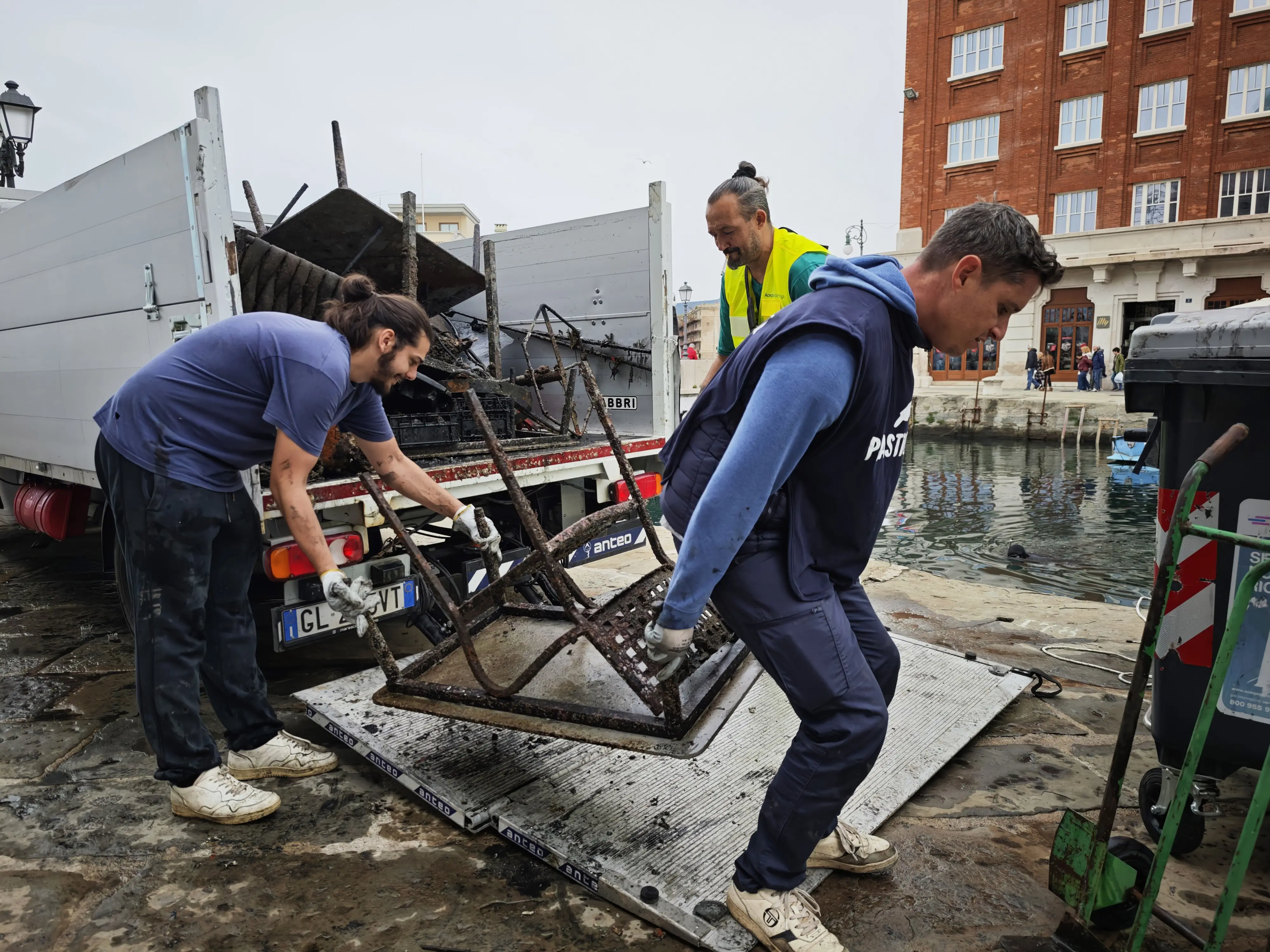 Dai fondali del canale Ponterosso riemergono tavoli, divanetti e anche una vecchia macchina da scrivere