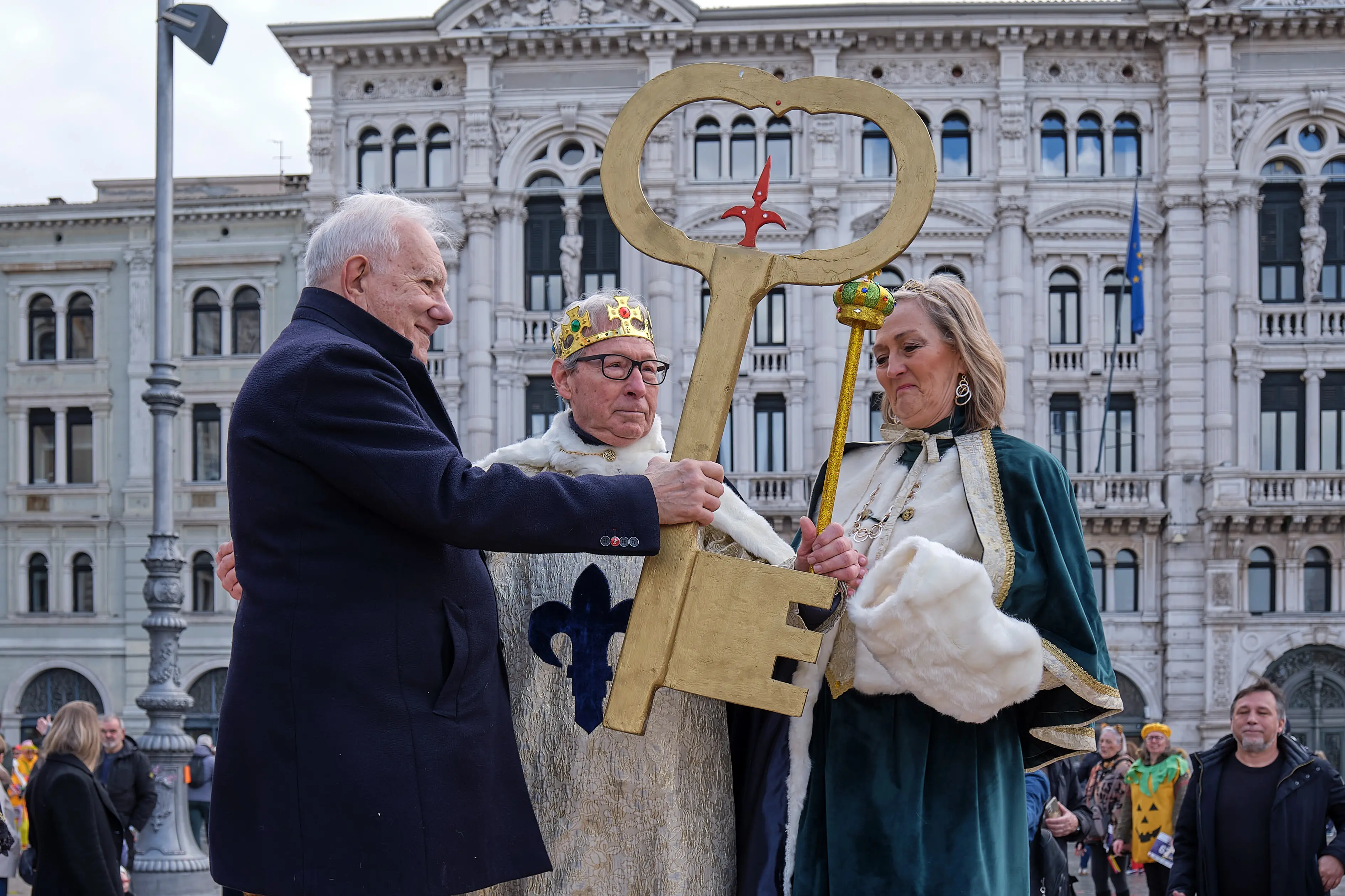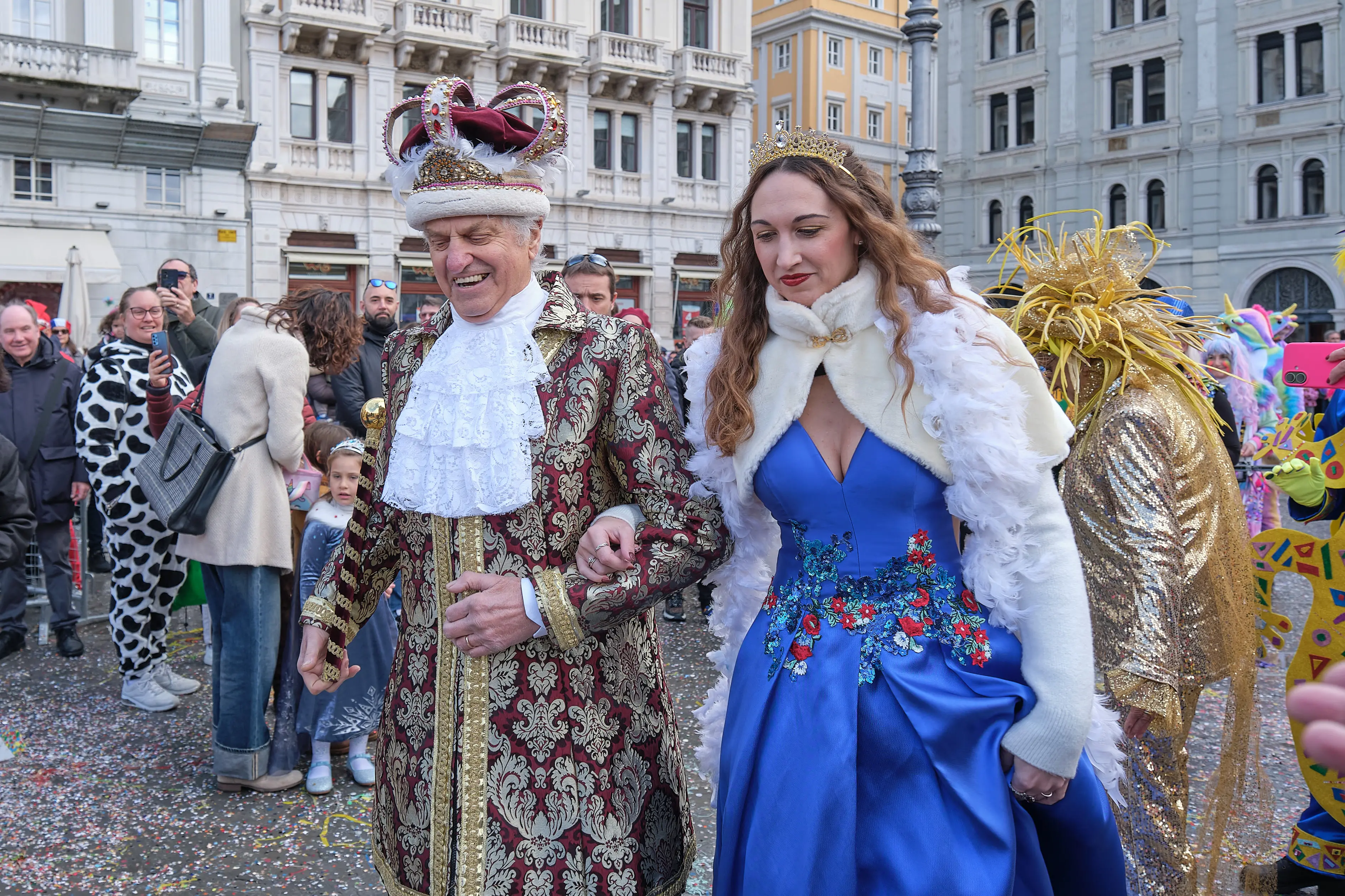 In piazza Unità c’erano anche Re Carnevale e Regina Quaresima, alias Gabriella Zorzenoni e Alessandro Tramarin, insieme al Re e a una delle madrine del Carnevale di Muggia, che hanno anche ricevuto le chiavi della città. Una cerimonia che ha dato ufficialmente il via al Carnevale di Trieste.