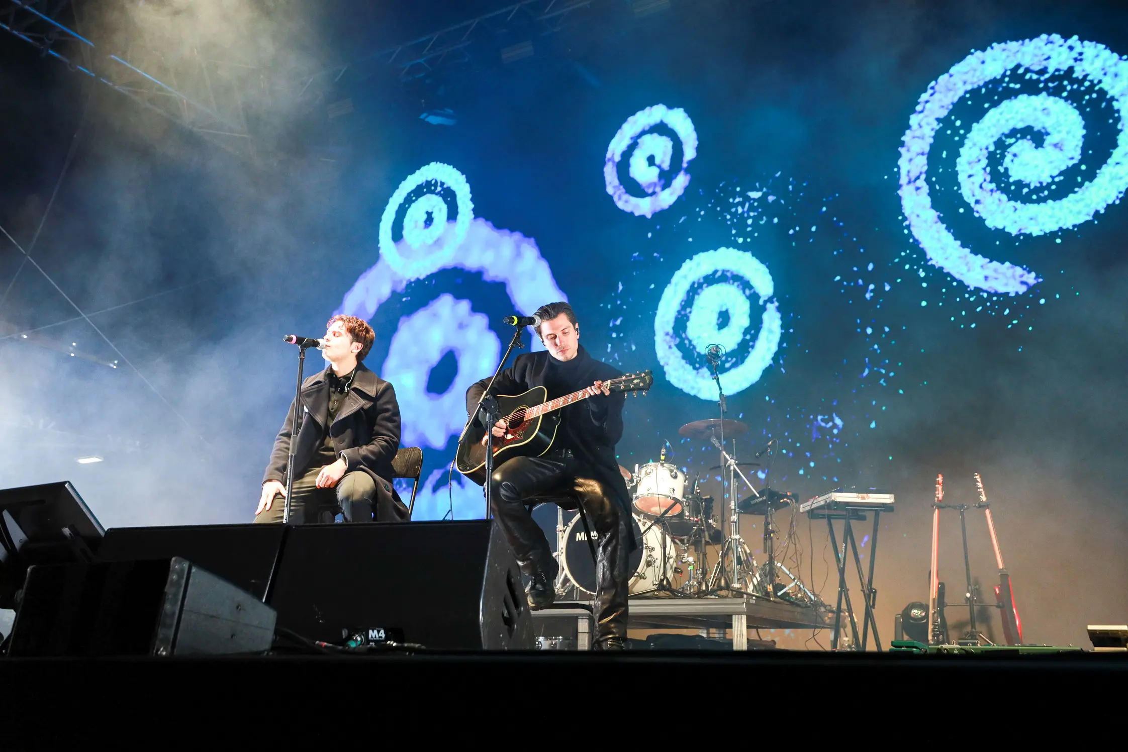 Il sipario si è alzato alle 21.10 con l’ingresso di Benji & Fede, accolti sul palco dal boato del pubblico. Una performance coinvolgente ed emozionante, eseguita solo con voce e chitarra, senza band per «trasportarvi insieme a noi nella nostra cameretta, come quando abbiamo iniziato a scrivere le prime canzoni». Tra le hit più note e alcuni brani degli esordi, il duo pop ha fatto cantare tutta la piazza.