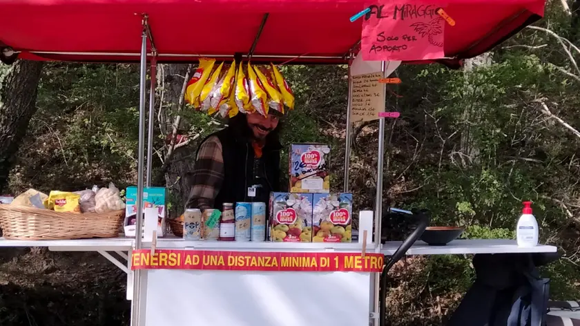 Munito del suo mini ciclo-market e di un permesso trasforma alcuni punti della pista in “tappe ristoro”