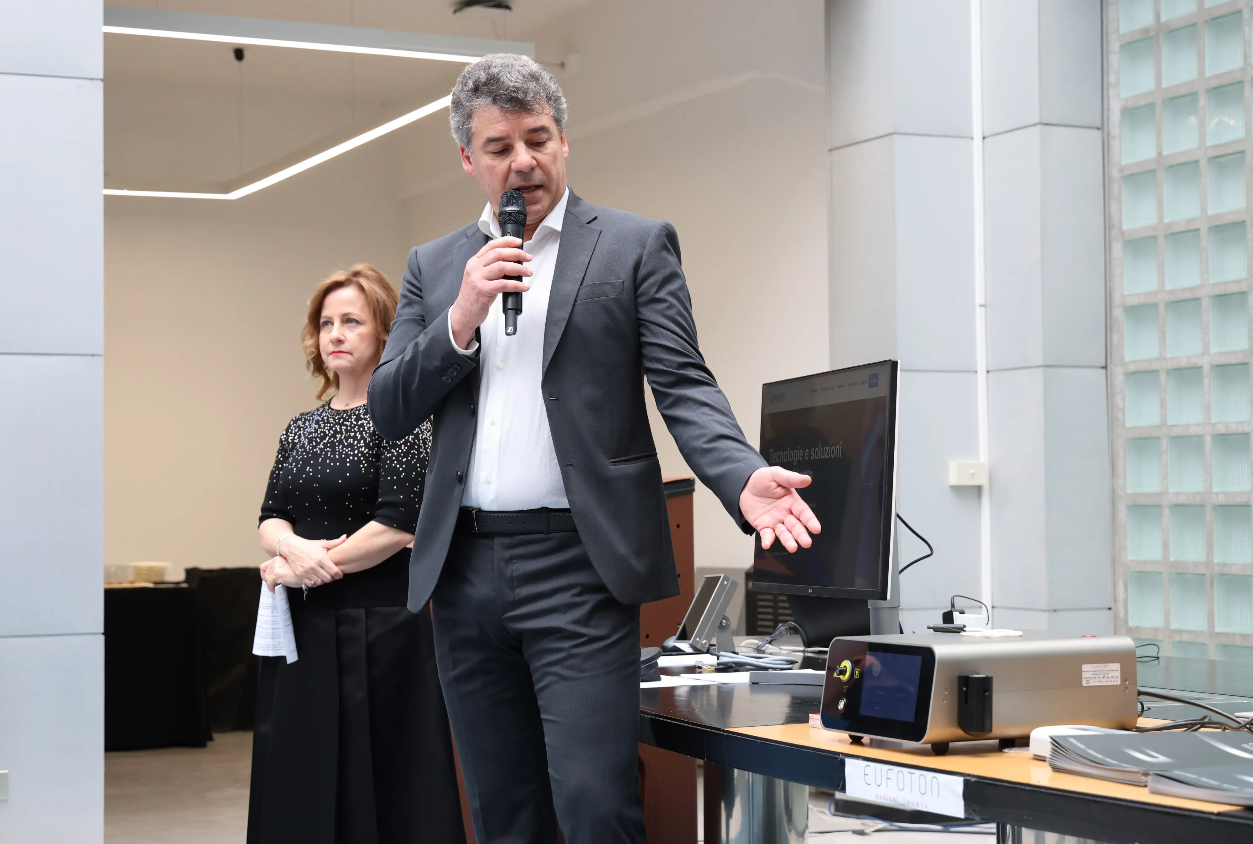 Nel corso dell’appuntamento “Dalla formazione superiore all’impresa: competenze e innovazione per il Made in Italy” sono stati presentati i prodotti di alcune delle società insediate in via Flavia. Dopo il saluto da remoto del ministro delle Imprese e del Made in Italy Adolfo Urso, nel campo medicale Andrea Buoso ha illustrato il dispositivo Lasermar 1500 della Eufoton Srl, uno strumento al laser sviluppato per eseguire un’ampia varietà di procedure sanitarie che ha permesso all’azienda di essere presente sui mercati di 50 Paesi.