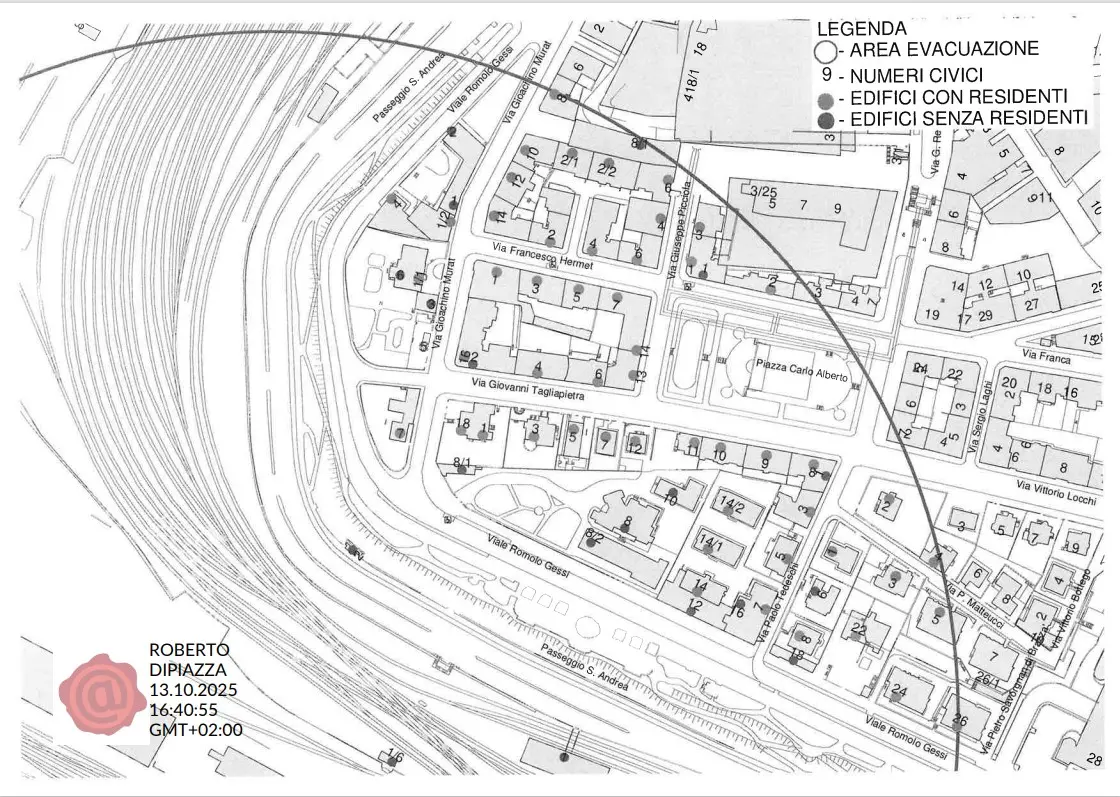 Secondo i calcoli dell’amministrazione municipale, l’evacuazione di Campo Marzio coinvolgerà un migliaio di persone. Gli uffici comunali hanno individuato tutti gli edifici che rientrano nella Zona Rossa e hanno diffuso la lista di quelli interessati al provvedimento strada per strada. In via Romolo Gessi sono i civici 2, 4, 6, 8/1, 10, 12, 14, 14/1, 14/2, 16, 18, 24, 26, 26/1; in via Matteucci sono i civici 1, 3, 4, 5; in via Tedeschi sono i civici 1, 2, 3, 5, 6, 7, 8; in piazza Carlo Alberto sono i civici 1, 2, 9, 10, 11, 12, 13, 14; in via Picciola sono i civici 1, 3, 4, 6; in via Hermet sono i civici 1, 2, 2/1, 2/2, 3, 4, 5, 6, 7; in via Murat 1, 1/1, 1/2, 3, 5, 7, 7/b, 8, 8/1, 10, 12, 14, 16, 18; in via Tagliapietra sono i civici 1, 3, 4, 5, 6, 7. Infine è interessata al provvedimento l’aera demaniale di passeggio Sant’Andrea.