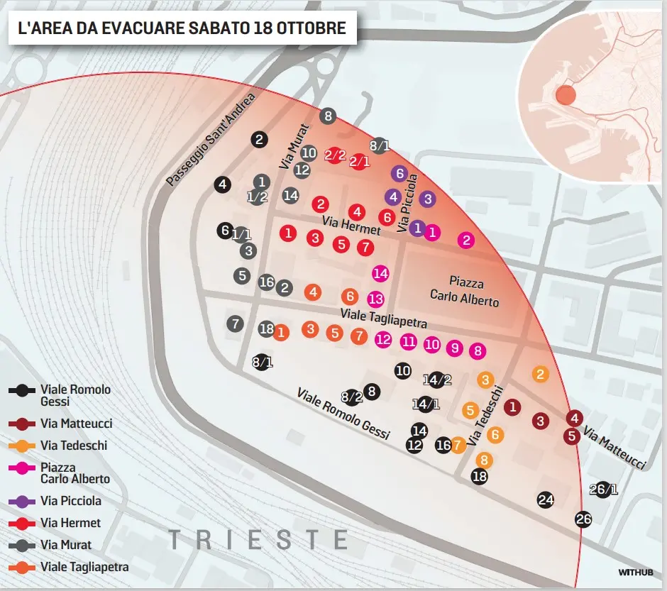 Una volta evacuata, sabato 18 ottobre la Zona Rossa sarà presidiata dalle forze dell’ordine. Questo accadrà, da un lato, per evitare accessi accidentali da parte di cittadini non informati delle operazioni di disinnesco della bomba venuta alla luce vicino al Magazzino 57 del porto; dall’altro, per scongiurare eventuali atti di sciacallaggio da parte di malintenzionati. Per i cittadini la sicurezza sarà dunque garantita a 360°: tanto per le persone quanto per le cose.