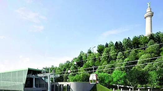 Un render della cabinovia sotto il Faro della Vittoria