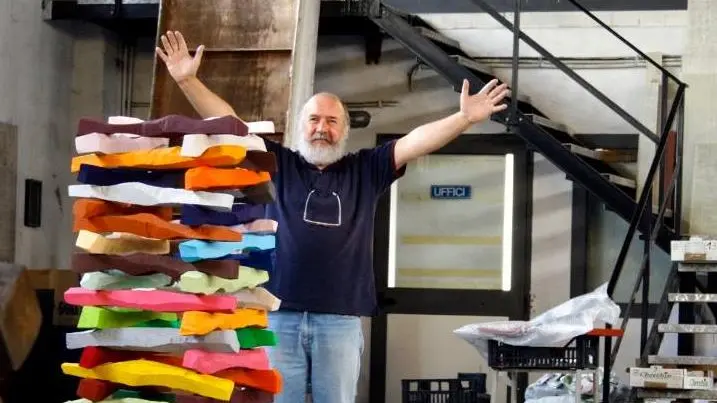 Enzo Valentinuz nel suo studio con una delle sue opere