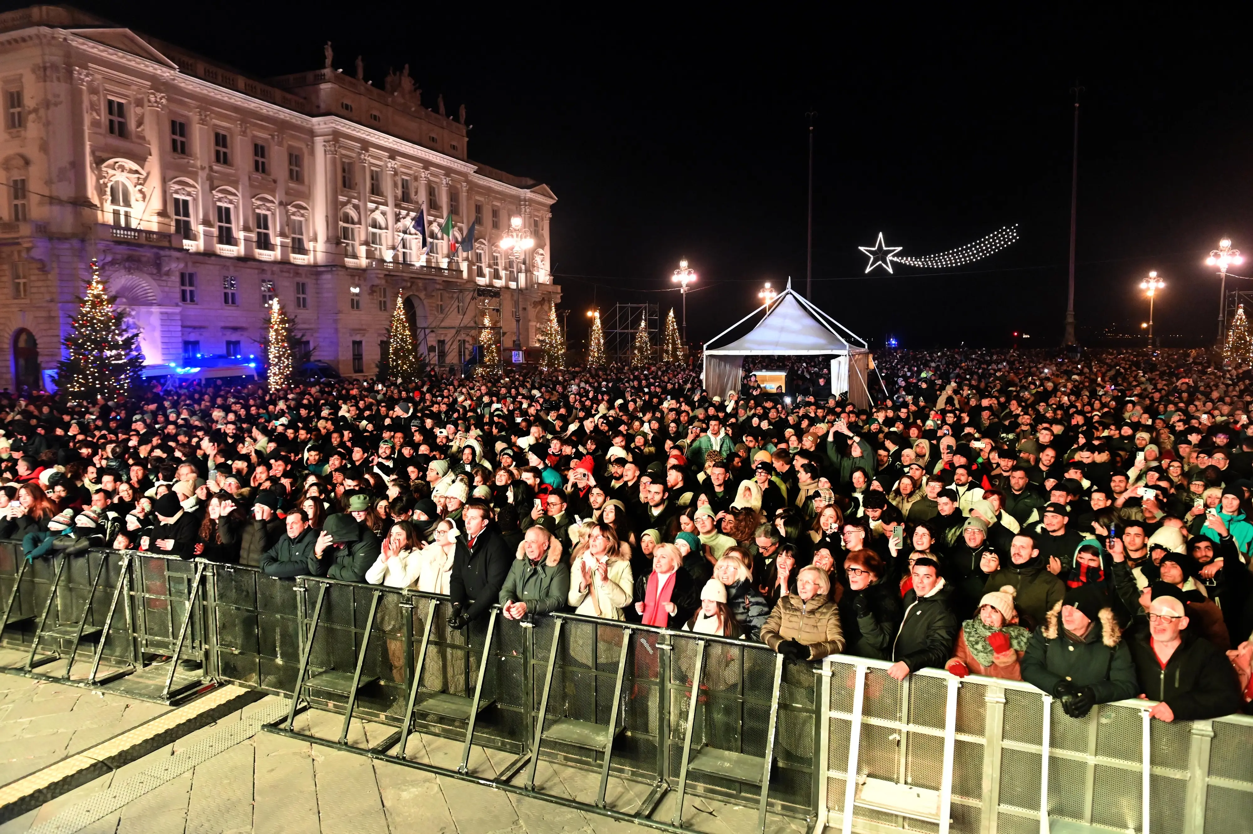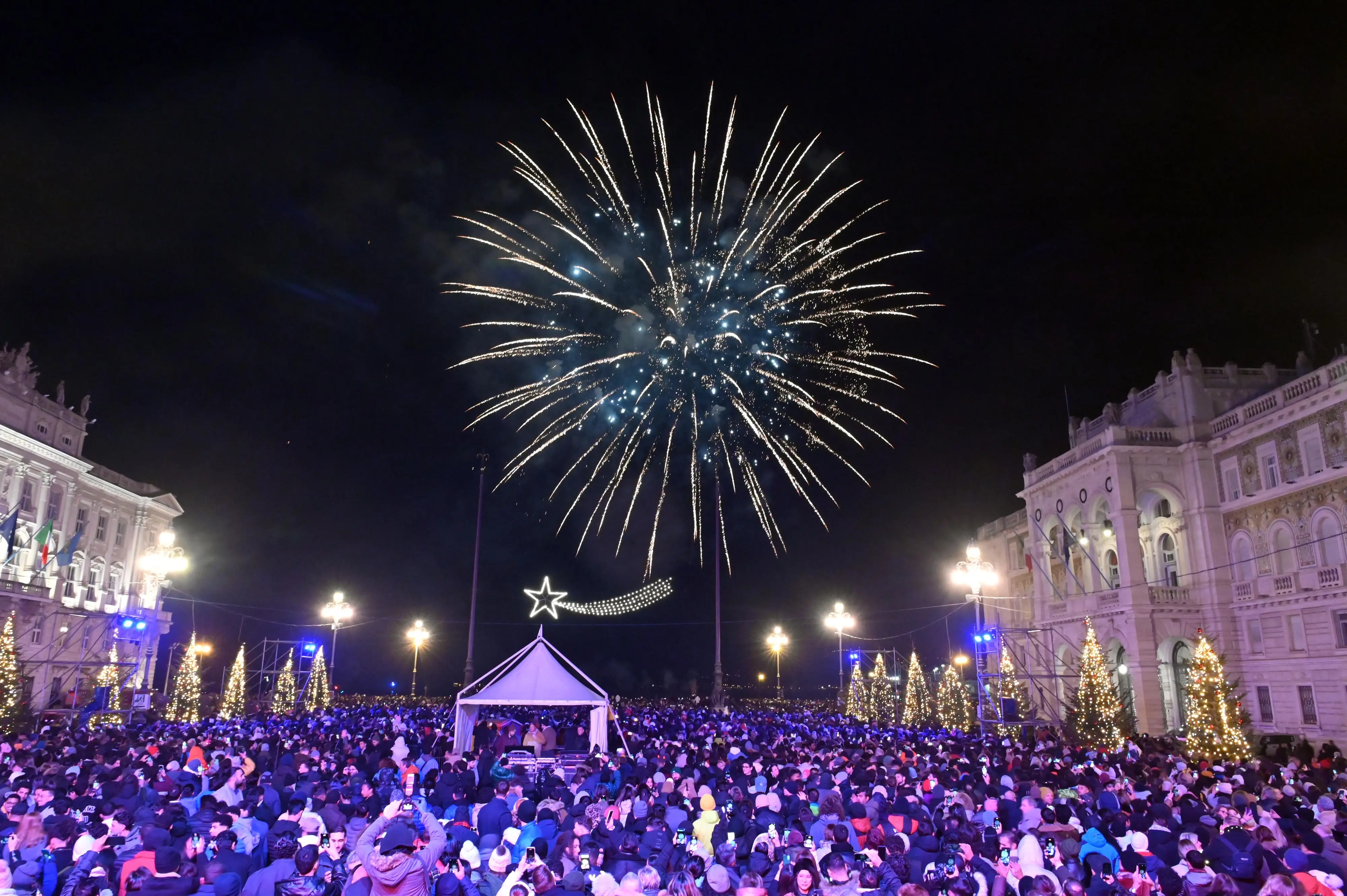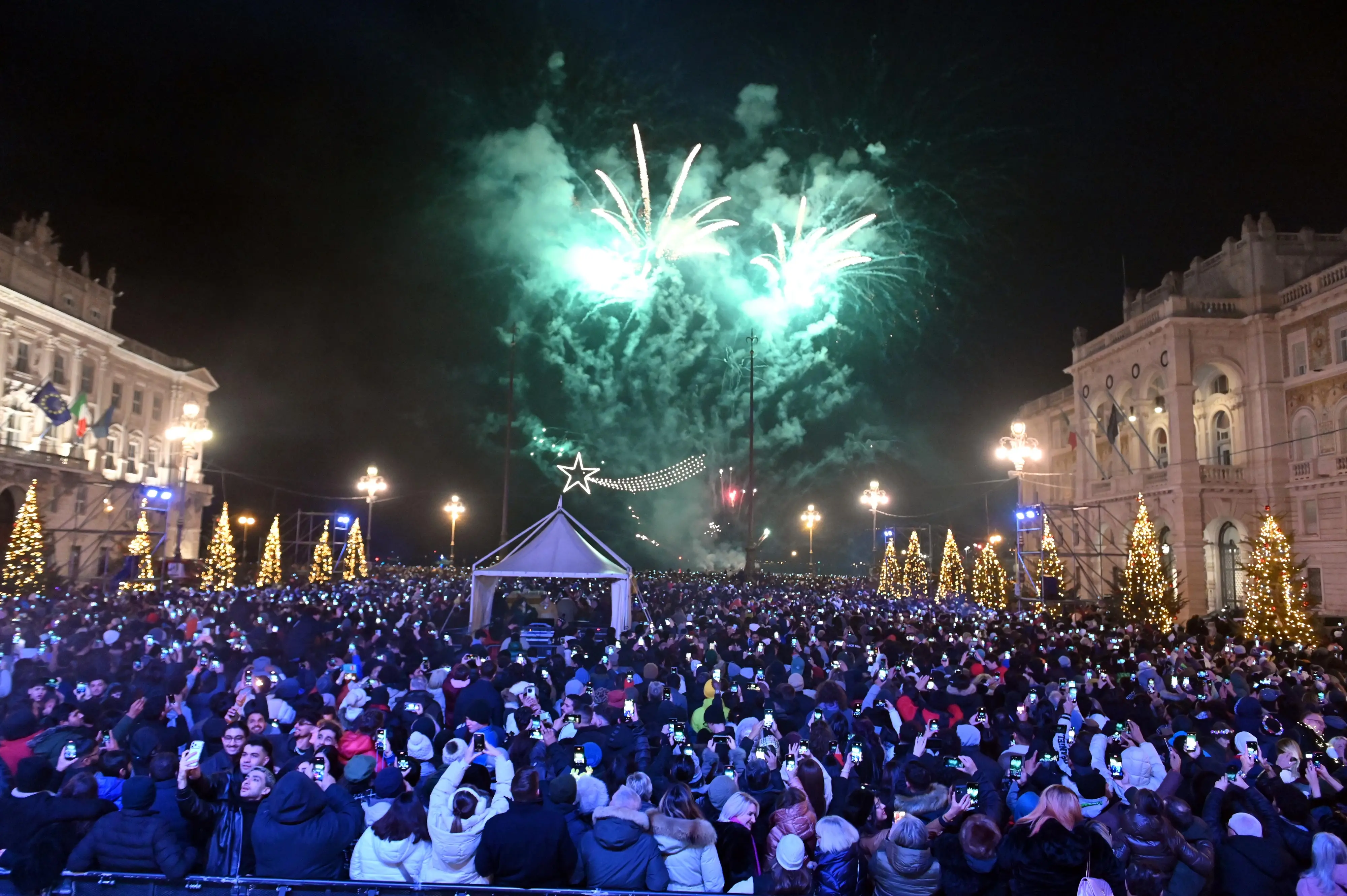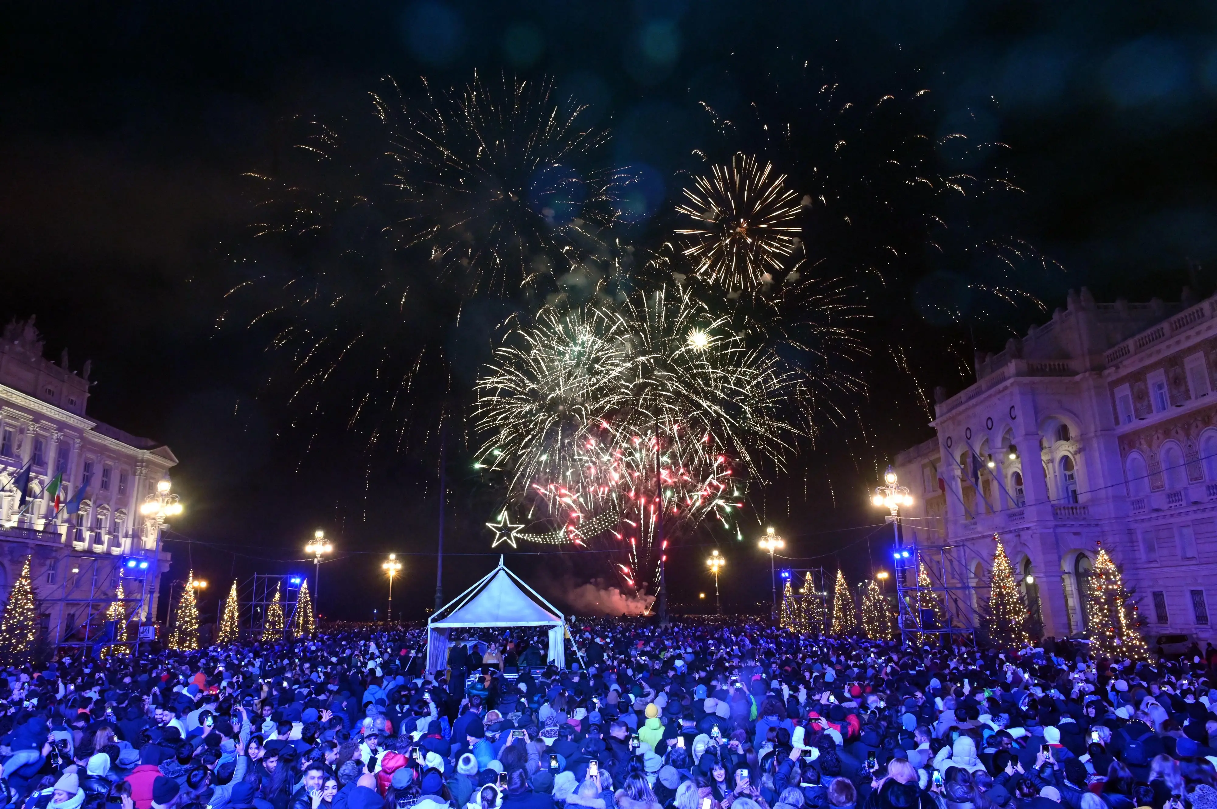 Capodanno a Trieste tra tornelli, controlli, fuochi e festa in piazza: le foto