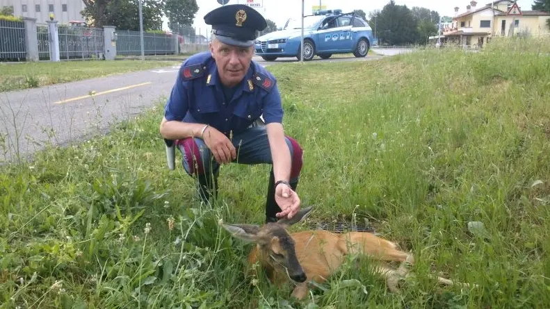 FIUMICELLO. È stata investita e poi abbandonata sul ciglio della strada. È viva solo grazie al tempestivo intervento della Polstrada di Udine e degli agenti del servizio risorse faunistiche e venatorie della Provincia di Udine. Una brutta avventura quella toccata a una femmina di capriolo di circa un anno trovata, verso le 5 del mattino di ieri, lungo la statale 14, tra Fiumicello e Villa Vicentina. È stata urtata da un’automobile. Il conducente, anziché fermarsi, ha preferito andarsene lasciando la povera bestiola, impaurita e dolorante, sul ciglio della strada. Fortunatamente è stata notata da alcuni automobilisti che hanno immediatamente allertato gli agenti della Polstrada di Udine, accorsi sul posto. La polizia stradale ha atteso che il personale del servizio risorse faunistiche e venatorie della Provincia entrasse in servizio (è operativo tutti i giorni dalle 7 alle 19 e risponde al numero verde 800961969) e poi la femmina di capriolo è stata data in custodia ad Alberto Della Vedova che, dopo averla caricata in macchina, l’ha portata da Maurizio Zugliani, titolare del centro di recupero fauna selvatica di Campoformido, gestito per conto della Provincia. «Sono stato contattato alle 5.30 di sabato dalla Polstrada – racconta Zugliani -. Ho fatto subito chiamare Della Vedova perché non posso intervenire direttamente per recuperare la fauna selvatica. Il mio compito è quello di accogliere le bestiole 24 ore su 24. Nel frattempo, Alberto aveva ricevuto anche una chiamata dalla Protezione civile. L’animale è arrivato traumatizzato. Dopo circa un’ora si è alzata: è stato un buon segno. Se non ha lesioni interne potrebbe farcela. La terrò qui finché non si riprenderà, poi la libereremo. Ma la legge prevede che quando si investe un animale bisogna fermarsi per prestare soccorso».