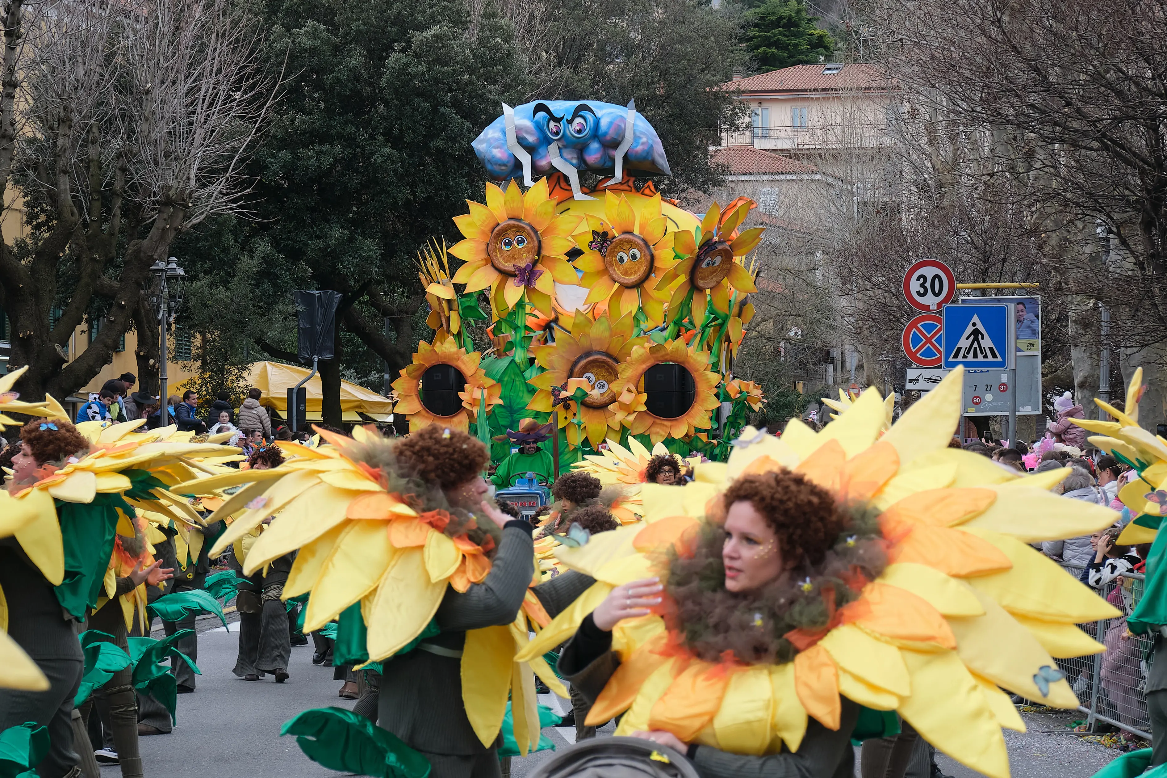 La prima compagnia a sfilare è stata quella delle Bellezze Naturali, con il motto “Tu mi fai girar”, tema ispirato dalla canzone “Bambola” di Patty Pravo, con il carro principale rappresentante girasoli che seguivano, come in una danza, un gigantesco sole che si innalzava in cielo. La seconda compagnia a sfilare è stata la Brivido, con il tema “Che aria che tira, ara”, il cui carro principale era rappresentato da una “Eola”, che ricordava tanto la premier Giorgio Meloni, svettante sopra un vortice in movimento senza tregua, determinata e pronta a soffiare su una barca battente bandiera italiana alla deriva tra le onde. Terza compagnia, in ordine di sfilata, è stata la Trottola con il tema “Gelatttoo!!!”.