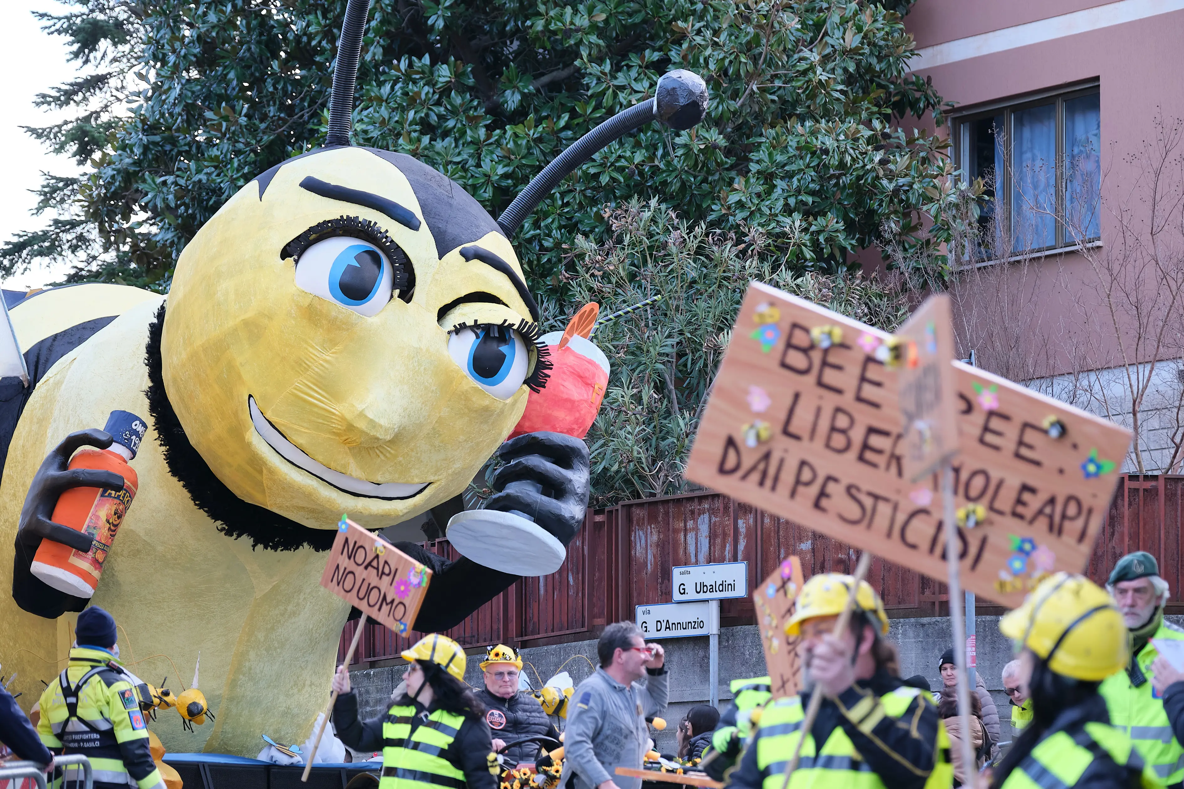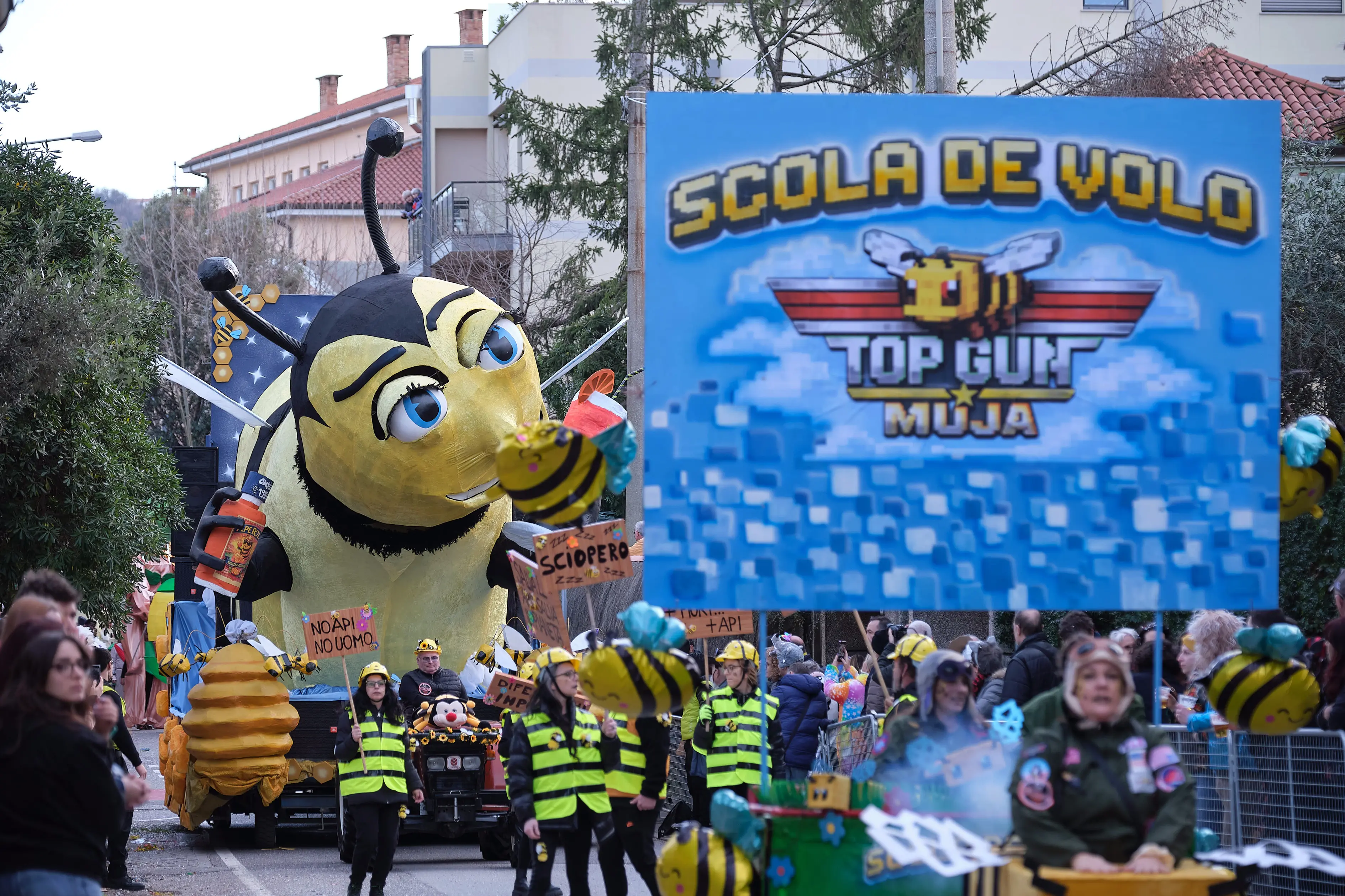 La Bora, con il tema “50 sfumature di viola” e con in cima al carro principale la mucca “Mulza”, viola ma da non confondere con quella della pubblicità della cioccolata, in quanto si tratta della versione muggesana, seduta comodamente su un prato fiorito, con tanto di campanaccio, ha sfilato per quinta. Sesta compagnia l’Ongia: con il tema “Femo…Ape!” aveva le api come protagoniste di un percorso istruttivo che si è chiuso con il carro principale rappresentante la mitica ape “Maila”, che ha ricordato a tutti gli spettatori il ruolo fondamentale delle api per la sopravvivenza del pianeta.