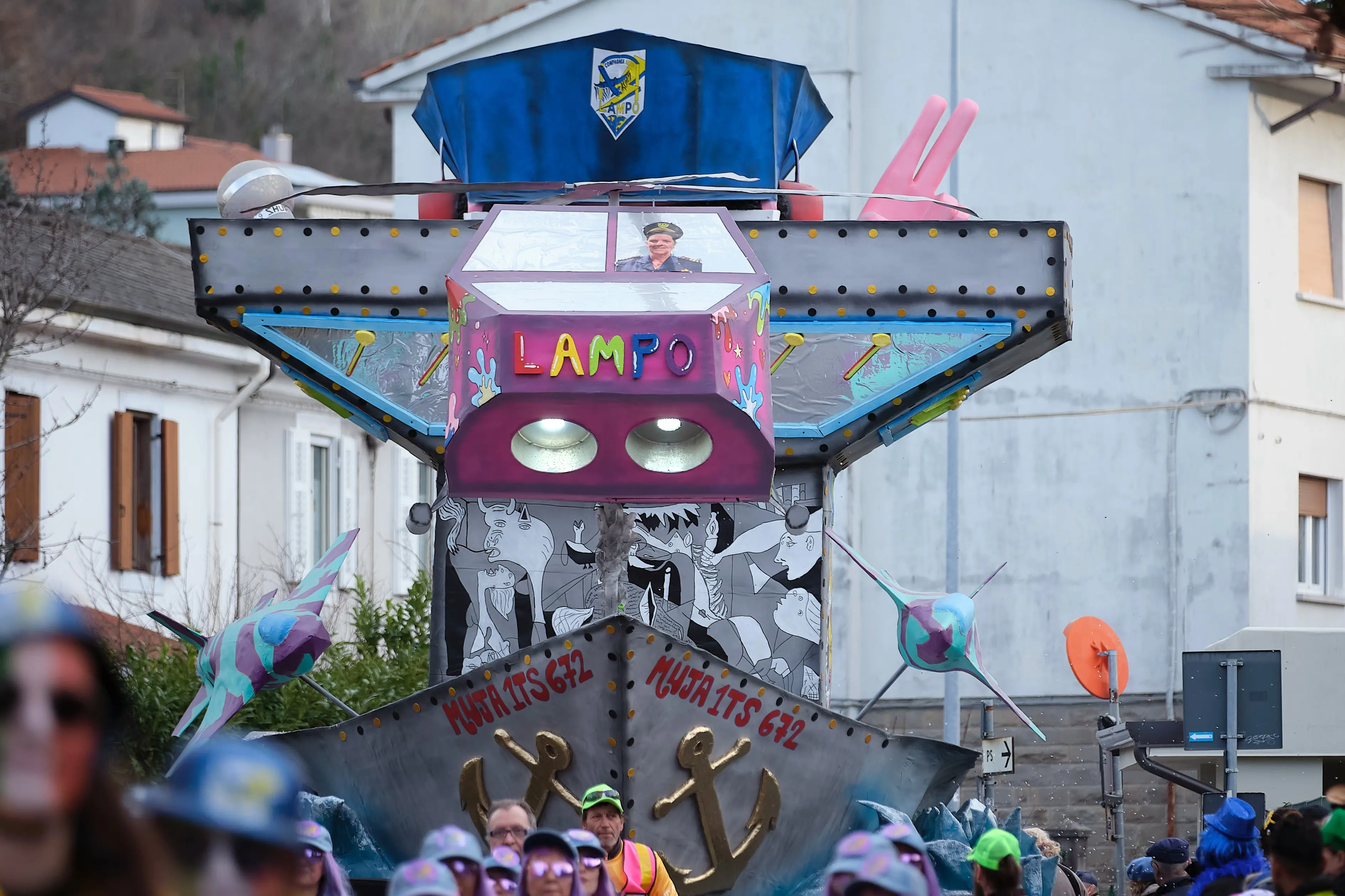 Infine la Lampo con il tema “La compagnia Lampo decolla in un lampo” che come carro principale ha presentato una grande portaerei, la Muja 2.0, che avanzava come un’isola galleggiante tra onde in movimento, sul cui ponte dominava un elicottero in stile hippy, colorato e decorato con fiori e simboli pacifisti. A guidare l’intera macchina scenica c’era il capitano disk-jockey che, dalla plancia, mixava musica e comandi, trasformando l’atterraggio finale in una festa collettiva. —