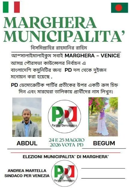 Domenica il cinema Dante era sold out, sul palco i candidati dem del comune e delle municipalità. Sabato anche Venezia è Tua di Ugo Bergamo, che sostiene la coalizione di centrosinistra, ha presentato i candidati bengalesi, in consiglio e in municipalità, assieme ai due candidati turchi. In realtà, i volantini e i santini di invito al voto scritti solo in bengalese sono tanti, compresi quelli dell’Udc _ che sostiene invece il centrodestra _ e che domani 28 aprile, presenterà i suoi candidati bengalesi, in consiglio comunale e in municipalità.