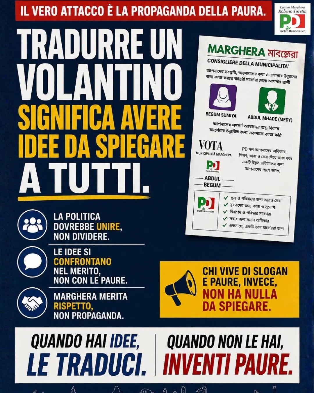 Nel mirino volantini elettorali in bengalese e iniziative rivolte agli elettori stranieri a Marghera. I dem replicano: «Tradurre è includere, la propaganda alimenta solo divisioni»