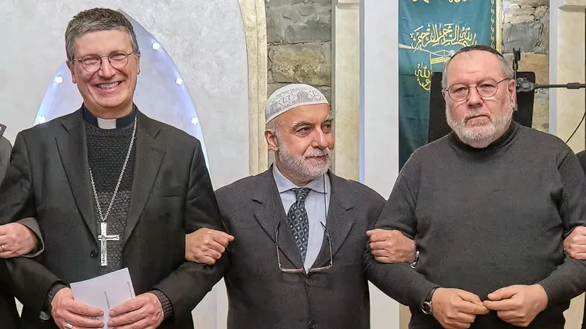 Da sinistra, il vescovo Enrico Trevisi, il presidente della comunità islamica Akram Omar e il rabbino capo Eliahu Alexander Meloni in moschea. Foto Silvano