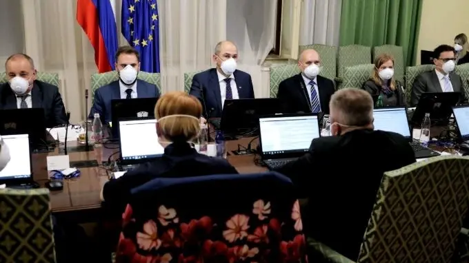 Nella foto d'archivio una riunione del governo sloveno, lo scorso aprile, con il premier Jansa al centro durante l'emergenza coronavirus. Ora la preoccupazione è tornata a crescere