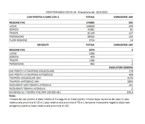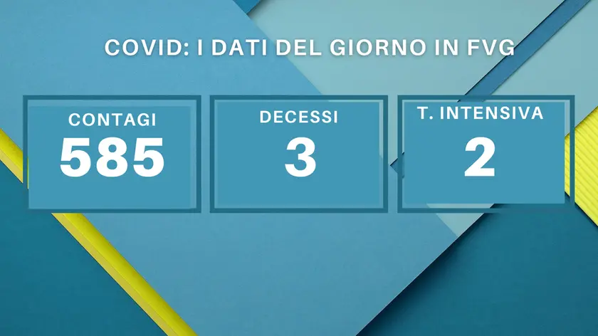 TRIESTE In Friuli Venezia Giulia sono stati registrati 585 nuovi casi e 3 decessi. Sul fronte delle ospedalizzazioni rimangono 2 i ricoverati in terapia intensiva, mentre scendono a 141 (-8) quelli in altri reparti.