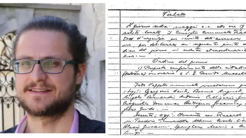 Il sindaco Enrico Bullian e, a destra, il documento con la cittadinanza onoraria a Benito Mussolini