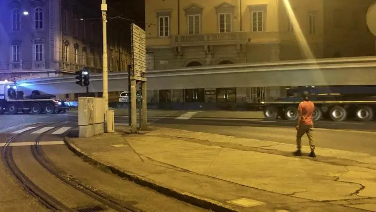 Record di lunghezza. Ecco l’«antipasto» delle prime 4 maxi-travi da 40 metri, su una commessa complessiva di 24 strutture, incaricate di coprire il Magazzino “28 bis” del Centro congressi. Sono arrivate ieri notte in Porto vecchio con due trasporti eccezionali lungo il percorso Grande Viabilità, Valmaura, galleria Foraggi, d’Annunzio, Carducci, Ghega (foto), Miramare. Ne giungeranno altre venti.