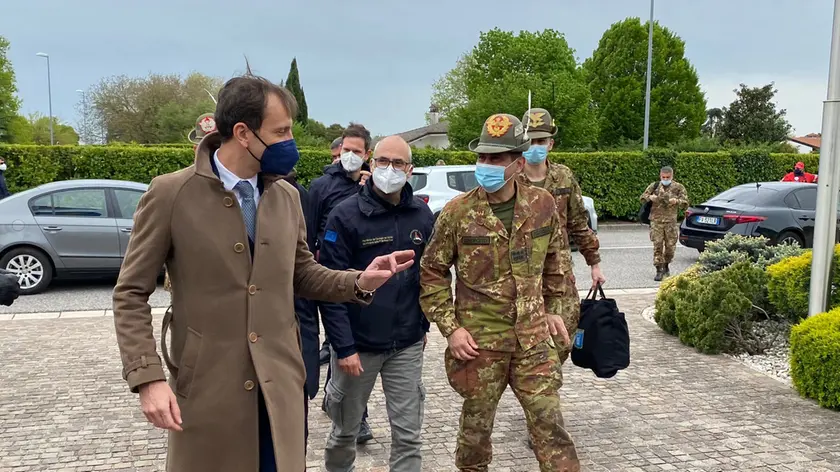 L'arrivo nella sede della Protezione civile Fvg del commissario Figliuolo accolto dal governatore Fedriga
