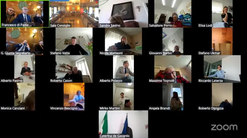 Dietro le webcam dei consiglieri si intravedono i rispettivi uffici, i salotti, le cucine, c’è chi si è sistemato direttamente in giardino; ma è quand