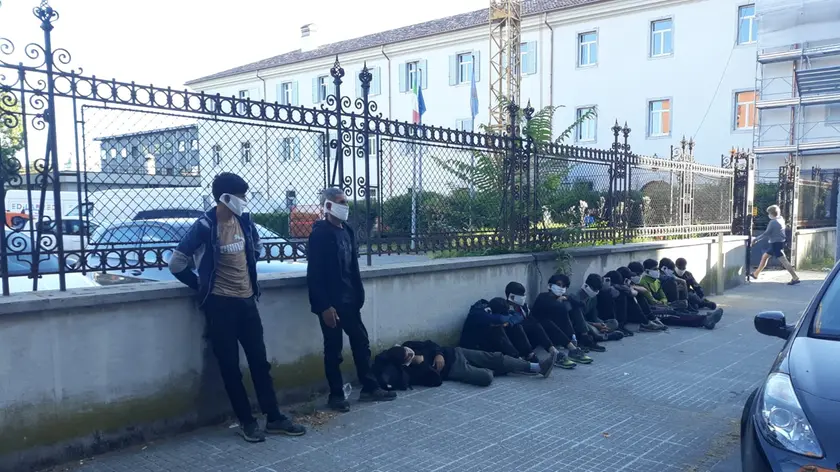 GORIZIA. Quattordici migranti, due in piedi, tutti gli altri seduti accanto al muro che delimita il parcheggio dell’Arcidiocesi in corso Verdi. Siamo
