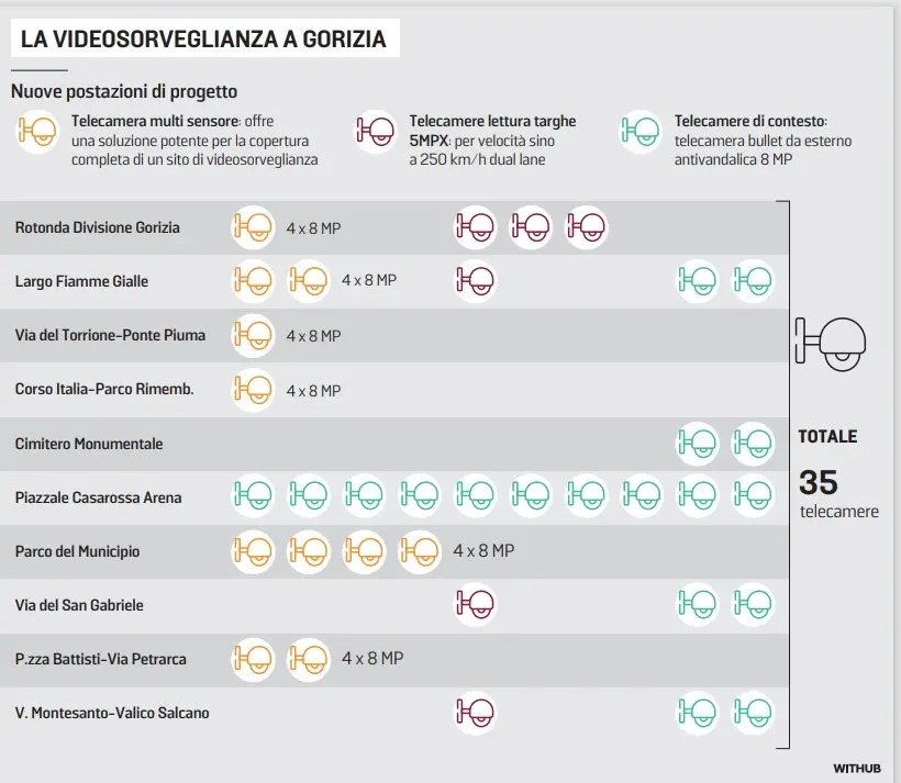 E, allora, entriamo nel dettaglio. Ebbene: la rotonda Divisione Gorizia sarà dotata di una telecamera multi sensore più altre tre per la lettura targhe. In largo Fiamme Gialle 2 telecamere multi sensore, 2 telecamere di contesto e una per leggere le targhe. Due punti di ripresa saranno installati al ponte di Piuma e al Parco della Rimembranza mentre il cimitero monumentale sarà dotato di 2 impianti.