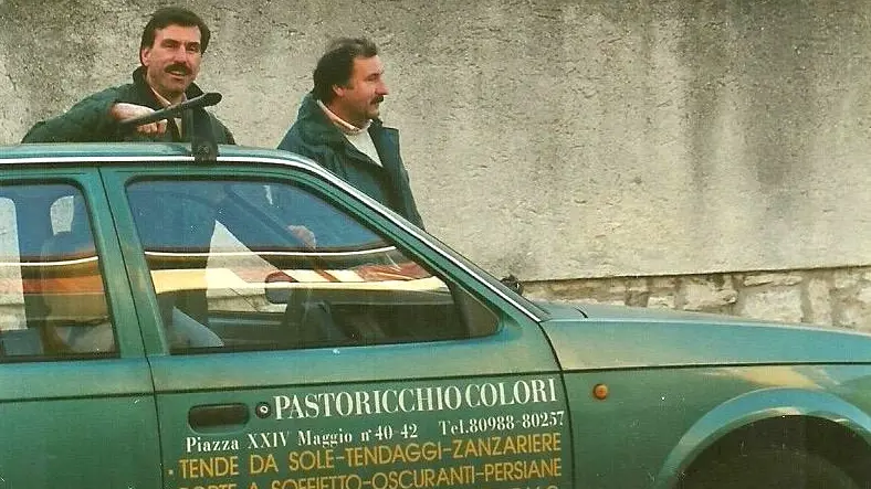 La storia lavorativa di Pastoricchio inizia, infatti, nel 1980, quando viene assunto dal fratello Giovanni nel suo negozio di colori, cornici e rivestimenti di viale dei Moreri. L’anno successivo i due fratelli (nella foto qui sopra li vediamo, Luigi è a sinistra, agli inizi degli anni ’90, con la loro auto di servizio) fondano la “Pastoricchio Colori”, che trova la sua sede nella decisamente più centrale via Caprin, dove assieme si dedicano a una rosa sempre più estesa di prodotti e servizi, quali i colori per edilizia e nautica, cornici per quadri, rivestimenti e tendaggi.