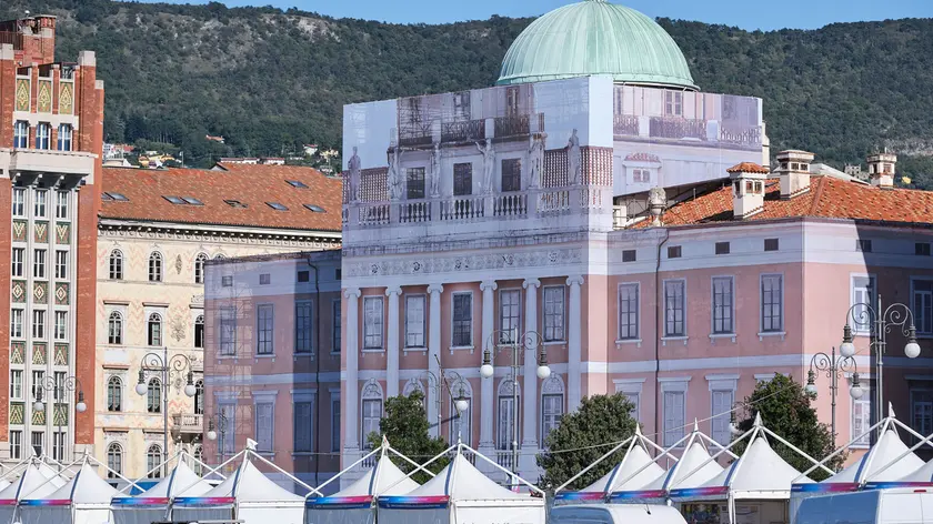 L’impalcatura con i teli ridisegna il Palazzo Carciotti di Trieste