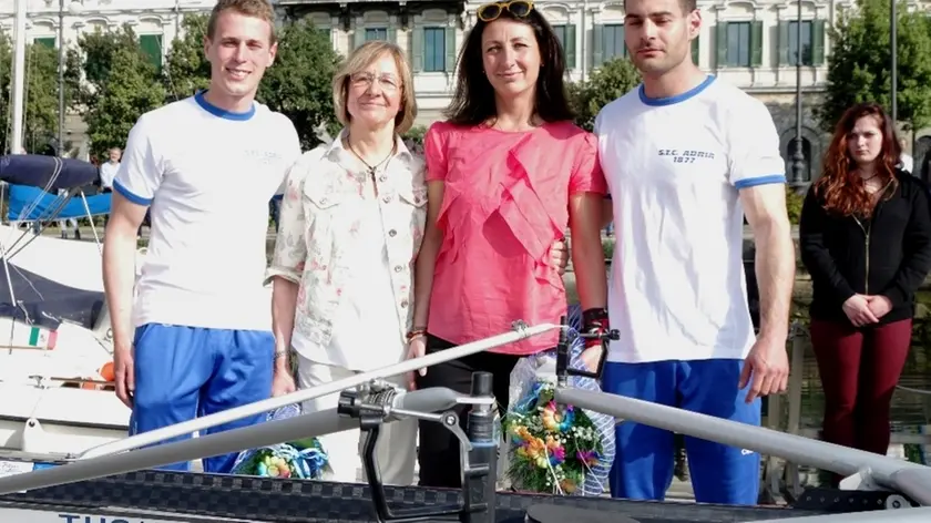 Prima della cerimonia, molto emozionante, è stato posto un cartellone che recitava con la scritta “Thomas con noi, sempre!” impreziosito da una quindicina di scatti fotografici che ritraevano il coordinatore della Grotta Gigante alle prese con uno dei suoi sport preferiti: il canottaggio. Sul pontile è arrivata poi una squadra di giovani atleti dell'Adria, rigorosamente in tenuta sportiva con i colori sociali del sodalizio triestino, il bianco e l'azzurro. Tra questi volti anche atleti che hanno conosciuto bene Thomas quando vogava quasi quotidianamente all'Adria.