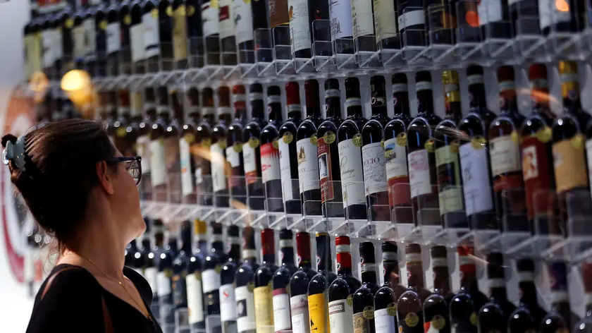 A visitor looks at Chianti's wine bottles displayed at the 50th Vinitaly international wine and spirits exhibition in Verona, northern Italy, April 11, 2016. REUTERS/Stefano Rellandini