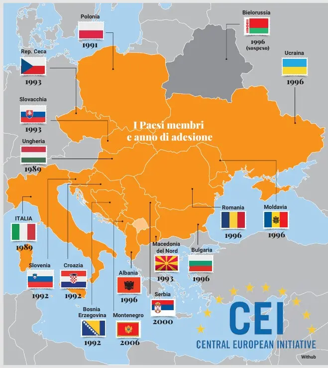 Nata nell’autunno del 1989 a Budapest, per iniziativa di Italia, Austria, Ungheria e l’allora Jugoslavia, l’Iniziativa è stata creata in un momento cruciale della storia europea, solo due giorni dopo la caduta del muro di Berlino, con l’obiettivo di favorire il dialogo politico, la cooperazione economica e il riavvicinamento tra Paesi a lungo separati dalla Guerra fredda. Un ruolo strategico che l’InCe è stata capace di mantenere negli anni immediatamente successivi, quelli del conflitto nei Balcani, ampliando progressivamente il suo network. Oggi sono 17 gli Stati aderenti, in parte già inclusi nell’Ue e in parte candidati a entrarvi, che a turno, per un anno, reggono la presidenza (ora è quello della Romania). Ce n’è un diciottesimo, la Bielorussia, al momento sospeso. L’ampliamento della platea è stato immediato con l’ingresso nel 1990 della Cecoslovacchia (e poi nel 1993 di Repubblica Ceca e Slovacchia) e nel 1991 della Polonia. L’eredità dello Stato jugoslavo è stata raccolta in pratica da tutti i suoi eredi tra il 1992 (Slovenia e Croazia) e il 2006 (Montenegro). Se l’allargamento a Est è stato costante, nel 2018 l’InCe ha perso l’Austria, che ha deciso di ricalibrare i propri interessi regionali.