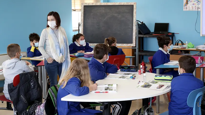 Un mese dall'inizio dell�anno scolastico alla Guido Negri di Vo' Euganeo, Padova, 5 ottobre 2020. Il primo comune d'Italia ad aver avuto un morto per pandemia, traccia un bilancio positivo dei giorni in aula, iniziati il 7 settembre e scanditi, una settimana dopo, dalla presenza del presidente della Repubblica Sergio Mattarella e della ministra dell'istruzione Lucia Azzolina. Su 650 alunni tra scuola dell'infanzia, elementari e medie sono i 50 gli studenti che hanno dovuto a sottoporsi a tampone nell'ultimo mese: tra questi non risulta alcun contagio da Covid. Nessuna classe è stata isolata. Oltre a quella sanitaria, Vo' vuole superare a pieni voti anche la gara della solidarietà . ANSA/NICOLA FOSSELLA