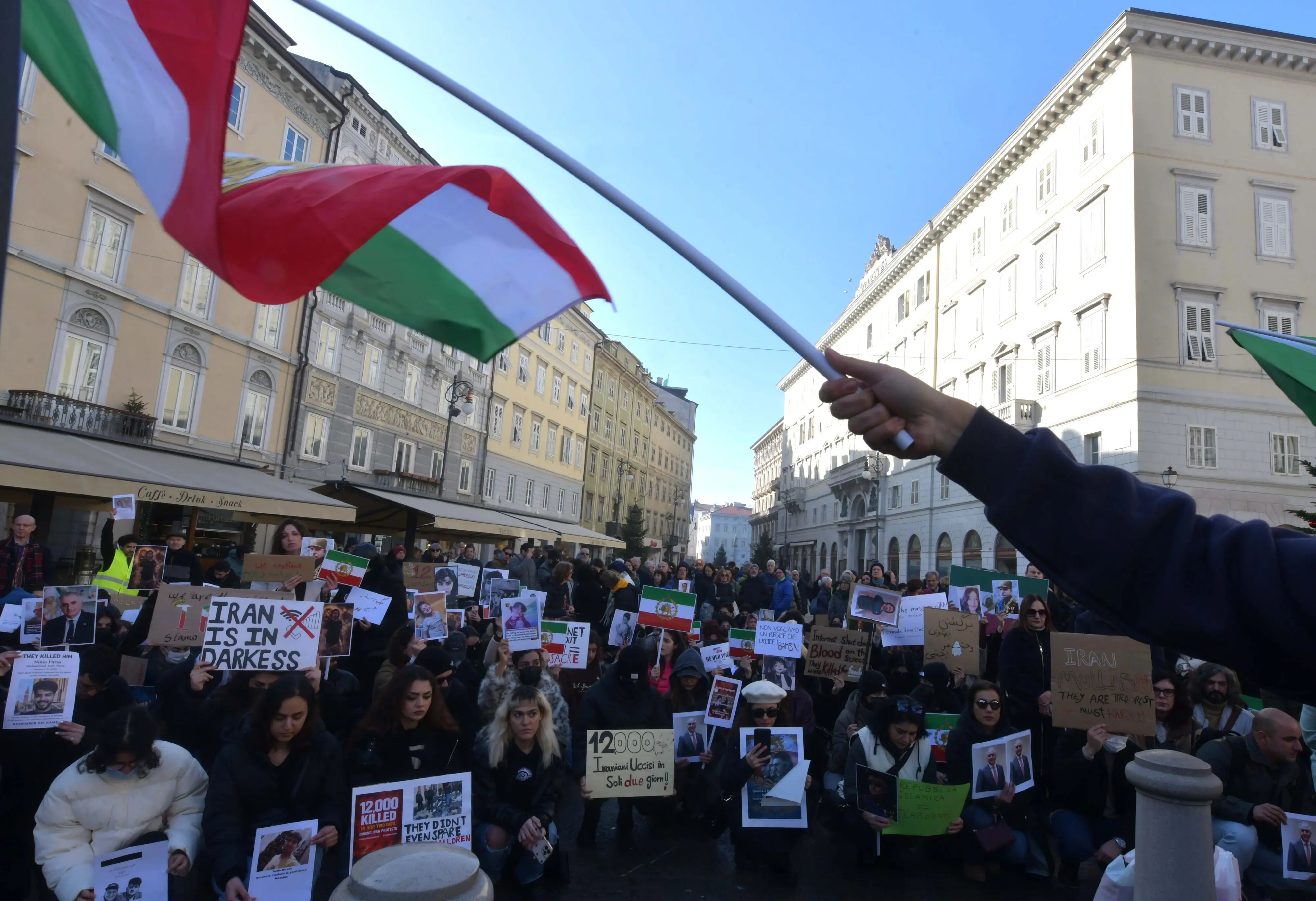 Sullo sfondo in persiano e in italiano le voci non intonano solo «Libertà, libertà», ma inneggiano anche a Reza Pahlavi, il figlio maggiore dell’ultimo scià Mohammad Reza Pahlavi. La sua immagine campeggia su diversi cartelli imbracciati dai manifestanti. «Se non lui chi? Non c’è un’altra figura», dice un giovane ingegnere che lavora a Udine ed ha voluto essere a Trieste. È rientrato giovedì in Italia, dopo essere rimasto fermo due giorni a Istanbul e prima bloccato per la chiusura dello spazio aereo a Teheran, a casa dei genitori che aveva raggiunto per le festività di fine anno.