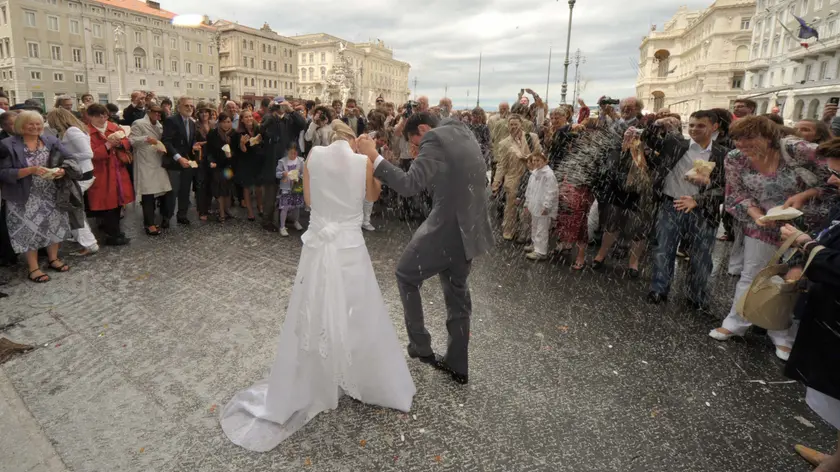 Pioggia di riso su una coppia di sposi in piazza Unità