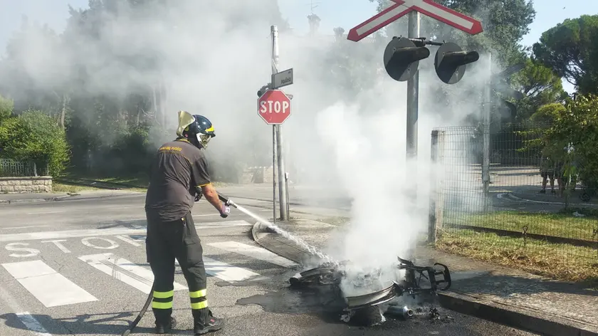 MONFALCONE. Attimi di paura a Monfalcone, giovedì 30 luglio poco dopo le 16, quando alcuni passanti hanno visto una moto prendere fuoco fra le vie Aquileia e Cosulich.