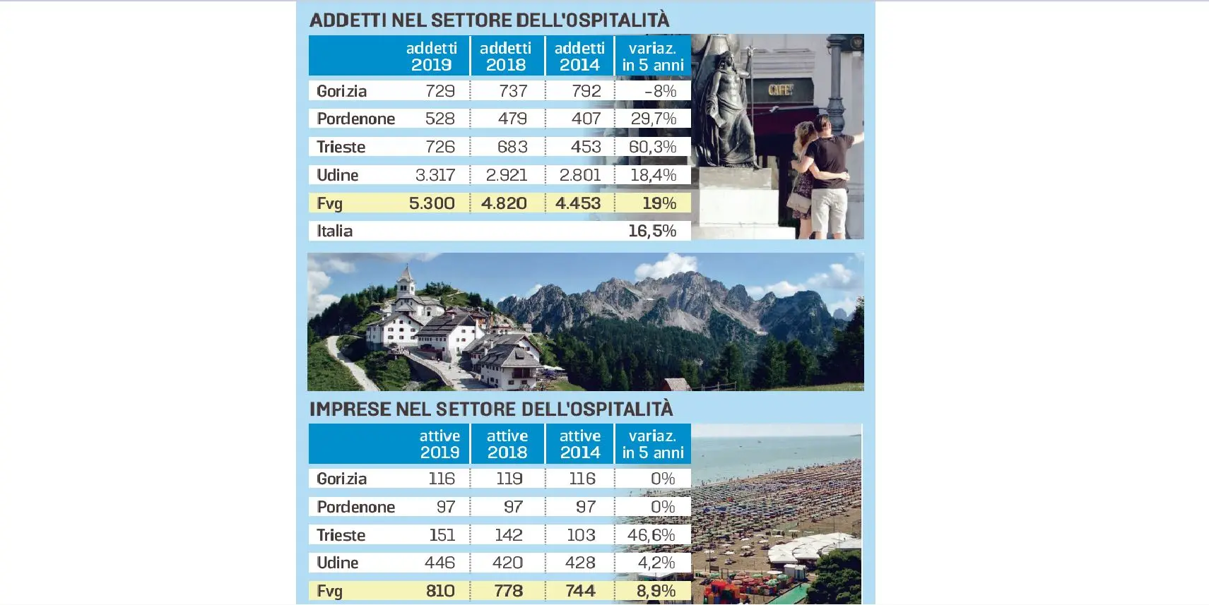 Di nuovo Trieste in vetta in regione per aumento di imprese attive nel settore dell’ospitalità in regione, con un +46,6% in cinque anni (da 103 aziende a 151), che alza all’8,9% un dato regionale che resta però sotto la media nazionale del 23%. Bene anche i numeri di Udine, mentre Pordenone e Gorizia si mantengono sul quinquennio agli stessi livelli.