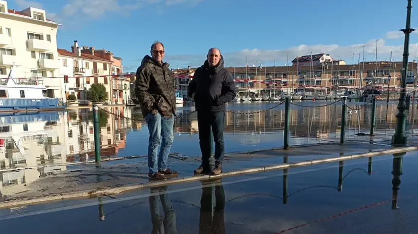 Luca e Michele Mariocco davanti al porto con l’acqua alta che si sta ritirando