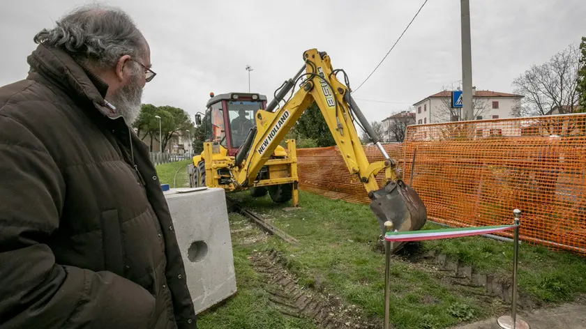 MONFALCONE. La benna ha raccolto la terra posandola sull’ex binario di Fincantieri, prima del taglio al nastro condiviso dai tre Comuni e dalla Region