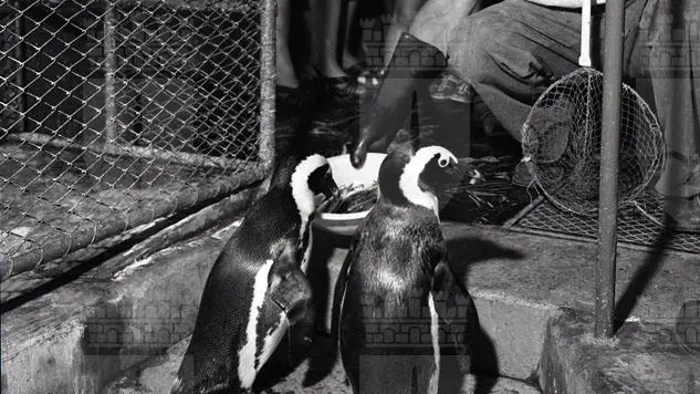 Marco e Gigi (il pinguino a destra) mentre vengono sfamati (foto archivio Foto Omnia di Ugo Borsatti di proprietà della Fondazione CRTrieste)
