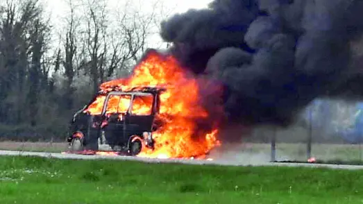 Prima il fumo dal cofano, poi le fiamme ovunque: camper prende fuoco in strada, salva una coppia
