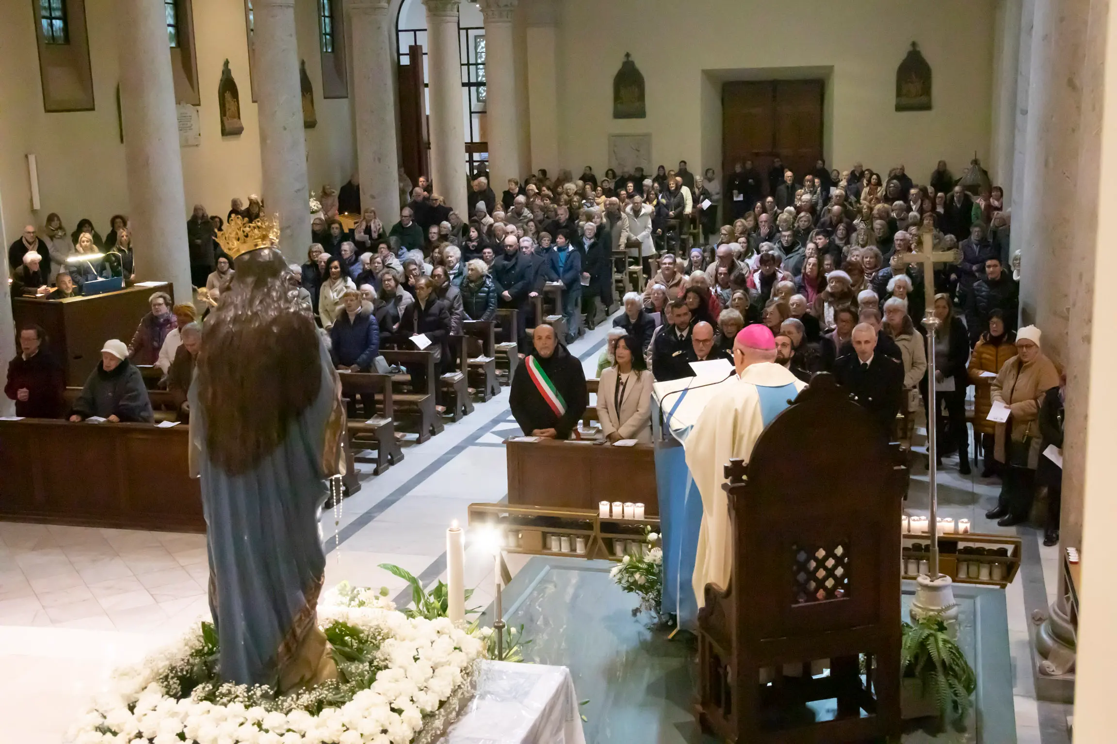 Sono solo alcuni dei passaggi consegnati alla comunità. La statua della Madonna della Salute spiccava, “immersa” in un tripudio di fiori candidi, punteggiati di “petali” rosa, nel silenzio assoluto dedicato all’ascolto e alla riflessione. Il gonfalone nei pressi dell’altare, era sorretto da un agente della Municipale. In prima fila le autorità istituzionali, il sindaco Luca Fasan e l’onorevole Anna Maria Cisint, i rappresentanti delle forze dell’ordine.