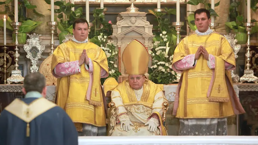 Sulle panche della chiesa i fogli del messalino festivo in latino, con la traduzione italiana a fronte, introducono i partecipanti allo svolgimento della liturgia. Recita il programma: «Solennità dell’Ascensione di nostro Signore Gesù Cristo al Cielo, (il cardinale, ndr) celebrerà nella nostra chiesa la santa messa solenne pontificale in latino secondo il rito detto di San Pio V, con l’assistenza di numerosi sacerdoti. Sarà presente anche la nostra cappella musicale diretta dal maestro Elìa Macrì che eseguirà la “Krönungsmesse” Kv 317 di Wolfgang Amadeus Mozart e, sempre del medesimo autore, l’“Exultate, Jubilate” Kv 165 e il “Laudate Dominum” Kv 339, mentre il “Proprio” sarà cantato in gregoriano».