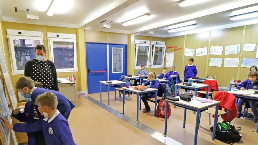 A Basovizza, all’inizio dello scorso anno, erano stati collocati 48 container blu, in un giardino privato davanti alla chiesa, assemblati insieme per realizzare oltre 400 metri quadrati di superficie, tra classi, aula docenti, biblioteca, spazi necessari alle procedure anti-Covid, oltre ai servizi igienici, e una piccola palestra. Il tutto per ospitare 46 bambini e gli insegnanti.