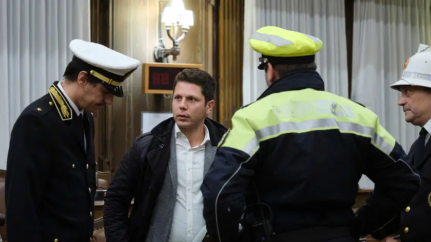 Ugo Rossi circondato dalla Polizia locale in aula Foto Silvano