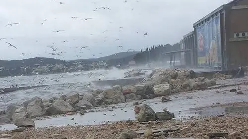 ROVIGNO. Onde alte che sembravano cattedrali, le rive e altre zone basse della città allagate dal mare, barche e battelli messi a durissima prova dal moto ondoso, fortissimo il vento di ponente. Onde alte ben 5 metri hanno sferzato il nucleo storico di Rovigno, andando ad abbattersi con una violenza inusitata, che ha visto gli schizzi di mare salire fino ad altezze impensabili. Molte le auto rimaste bloccate dall’acqua. A causa del maltempo, gran parte della città è rimasta per ore senza elettricità. Il vento da ovest si è fatto sentire anche tra Salvore e Capo promontore. Parenzo è stata investita da onde che hanno spazzato a lungo la riva. Il mare ha invaso la strada regionale di Antenal, che collega Torre e Cittanova, andando a congiungersi con forza al fiume Quieto che in quest’area finisce il suo viaggio. La gran massa d’acqua finita sulla strada ha complicato notevolmente il transito ai veicoli. La notte prima buona parte della Penisola istriana ha subìto piogge abbondanti. A Poljane sono stati registrati ben 107 litri di pioggia per metro quadrato, a Gimino 58 e a Pisino 53 litri. Trascurabili o quasi sono state le precipitazioni che hanno interessato il meridione dell’Istria. Se il Quarnero, protetto alquanto bene dal suo arcipelago, non ha avuto seri problemi (in tilt solo i due catamarani che collegano Fiume e le isole nord adriatiche), la Dalmazia ha passato ore di passione. Il territorio maggiormente colpito è stato lo Zaratino. La città di Zara è stata colpita da onde alte 2 metri, che hanno allagato parte del suo nucleo storico. Molti traghetti e catamarani sono rimasti fermi agli ormeggi. É il caso pure dello Spalatino, dove lo scirocco ha bloccato tutti i collegamenti dei catamarani, come pure le tratte – mantenute dai ferry – tra Spalato e le isole di Lissa, Lesina, Curzola e Lagosta.