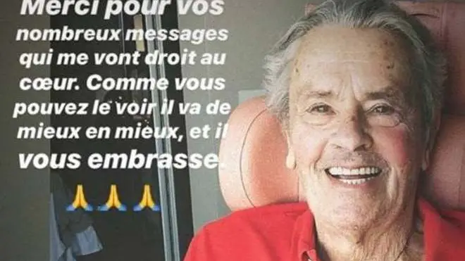 Nuovo messaggio rassicurante sulla salute di Alain Delon, vittima di un ictus qualche settimana fa. È stato il figlio Alain-Fabien a postare una foto del padre, sorridente, su Instagram. «Grazie per i vostri numerosi messaggi che mi vanno dritti al cuore. Come potete vedere, sta sempre meglio e vi abbraccia», ha scritto